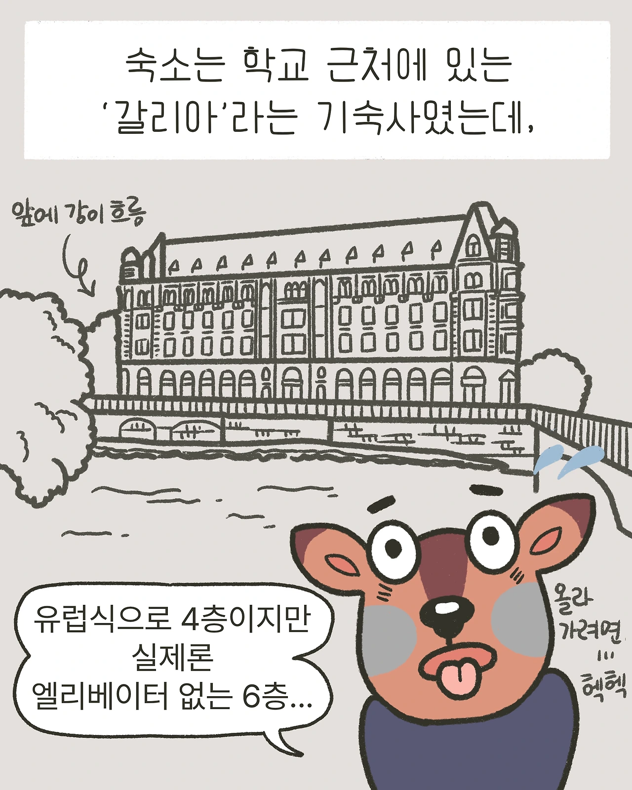 1층이 0층인 유럽식으로는 4층이지만 실제로는 가운데 애매한 층 하나가 더 껴있어 엘리베이터가 없는 6층이었다.