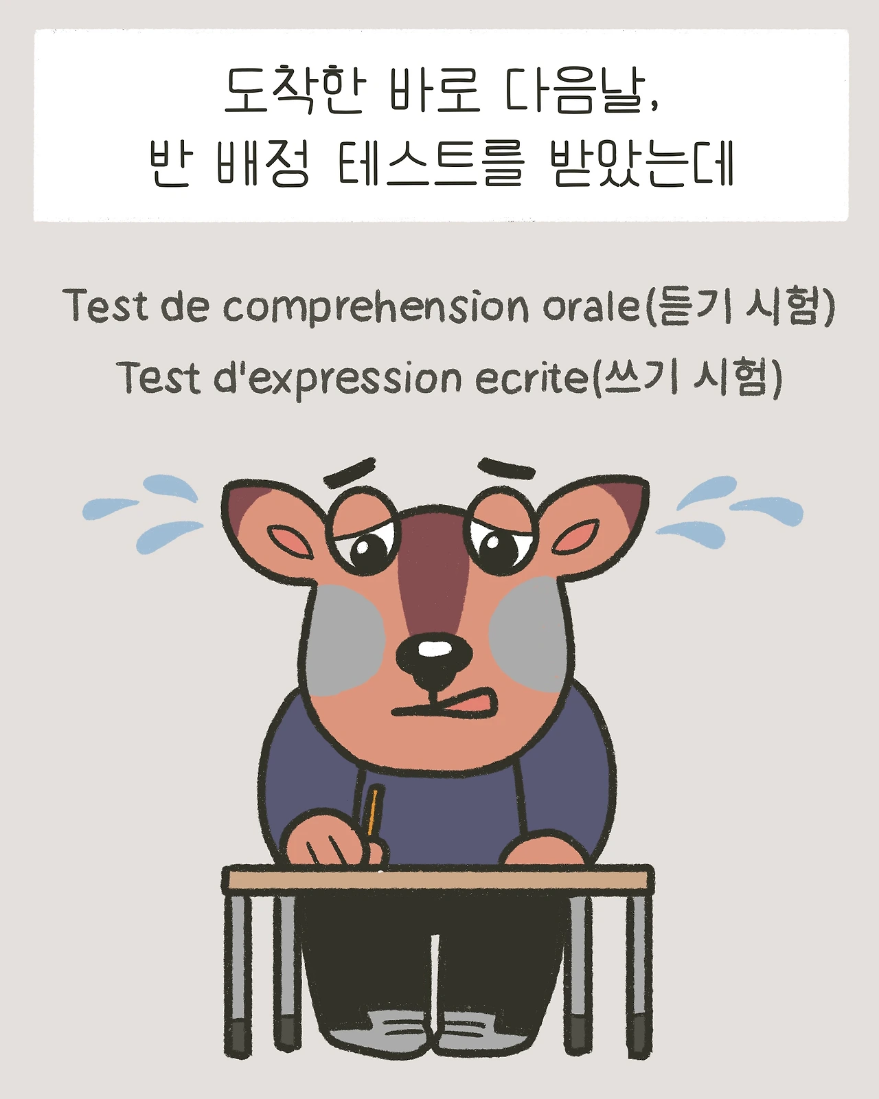 듣기 시험(Test de comprehension orale)과 쓰기 시험(Test d'expression ecrit) 두 가지로