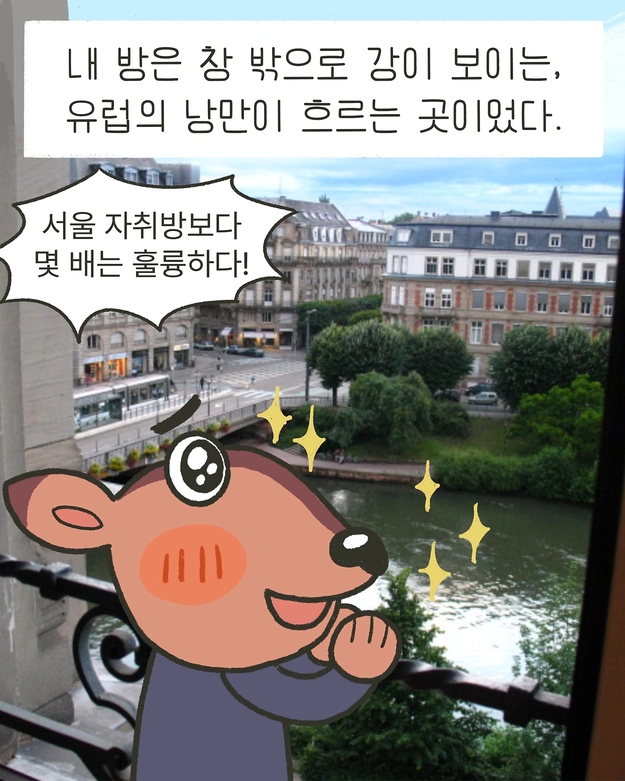 저녁에 다시 가보니 큰 창 너머로 강이 보이는, 유럽의 낭만이 흐르는 곳이었다.