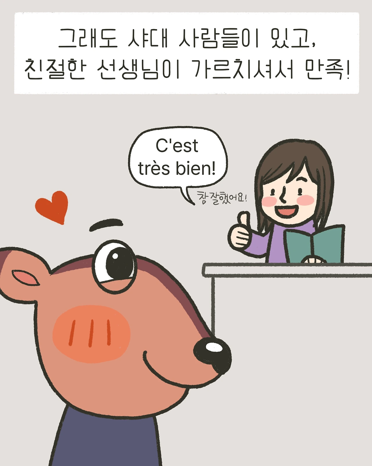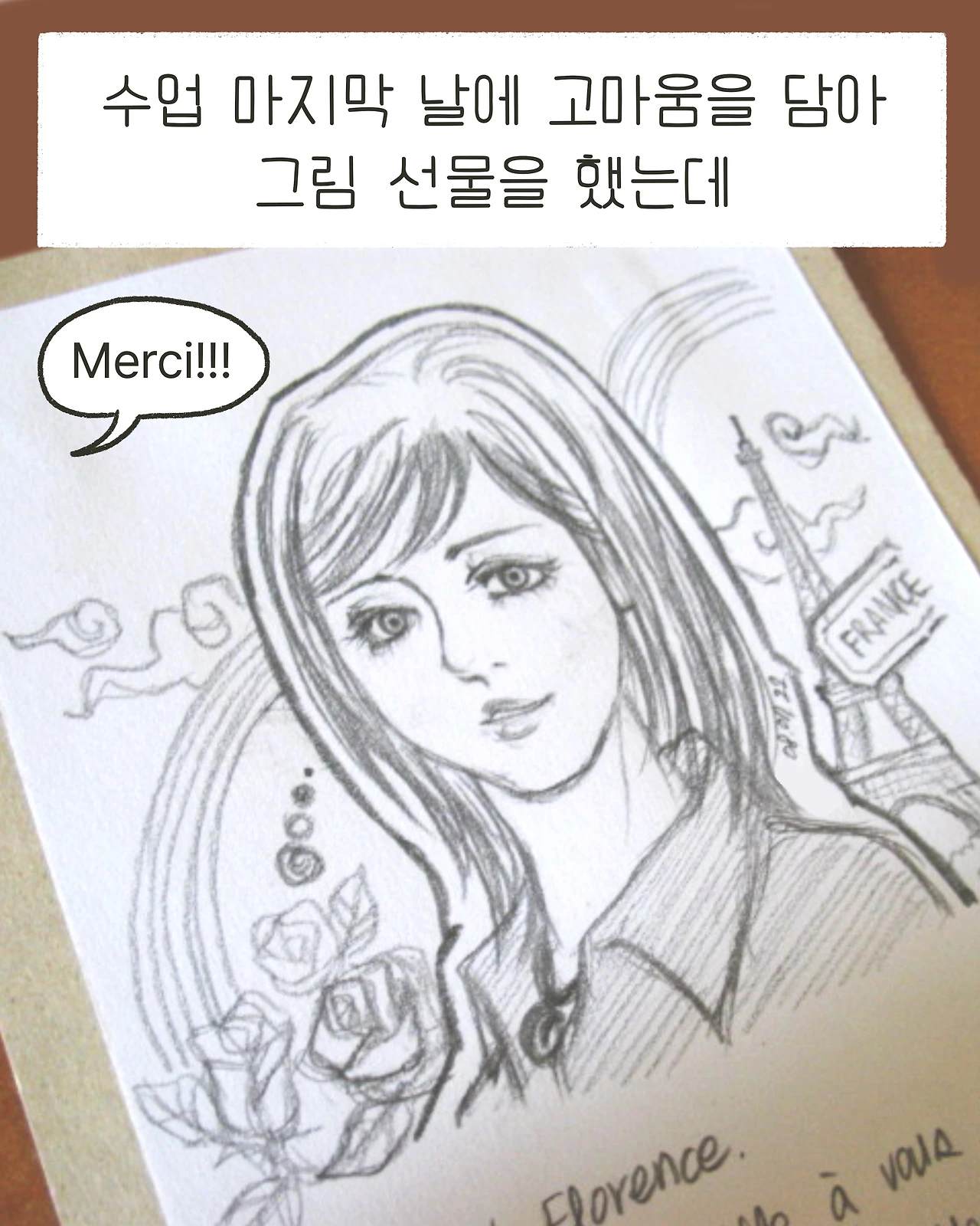 3주 후 마지막 수업 때 그동안의 고마움을 담아 캐리커처와 함께 짧은 편지를 선물로 드렸는데
