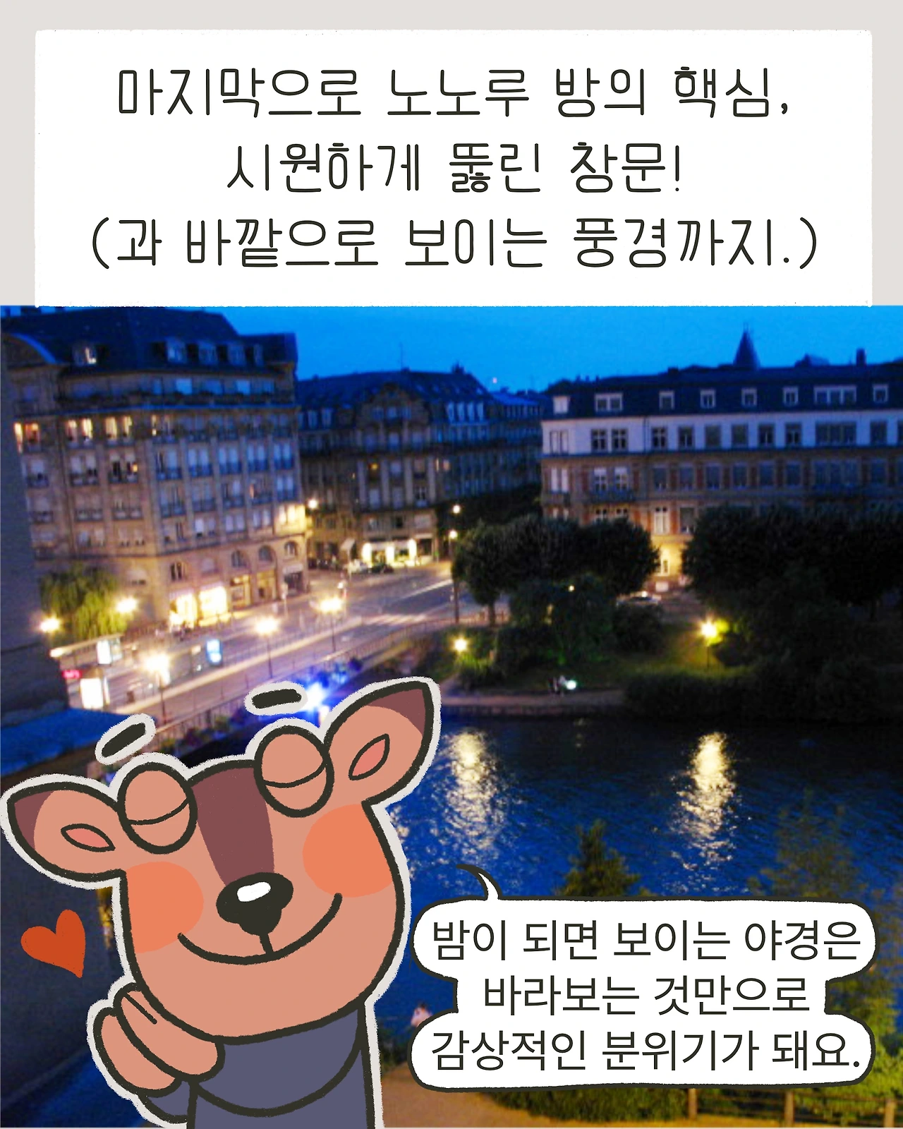 마지막으로 노노루 방의 핵심, 시원하게 뚫린 창문과 바깥으로 보이는 강의 풍경.