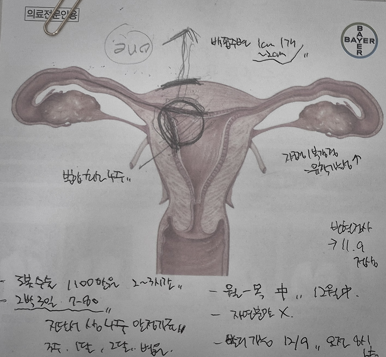 점막하근종 2cm는 단일공 로봇수술로 제거하기로 했고, 언제 생겼는지 모를 폴립(용종)은 자궁경으로 제거하겠다고 하셨다. 수술 날짜는 가장 빠른 12/16로 잡고, 아무것도 안 먹고 간 덕분에 다행히 채혈 등 일부 검사는 그날 다 진행할 수 있었다.