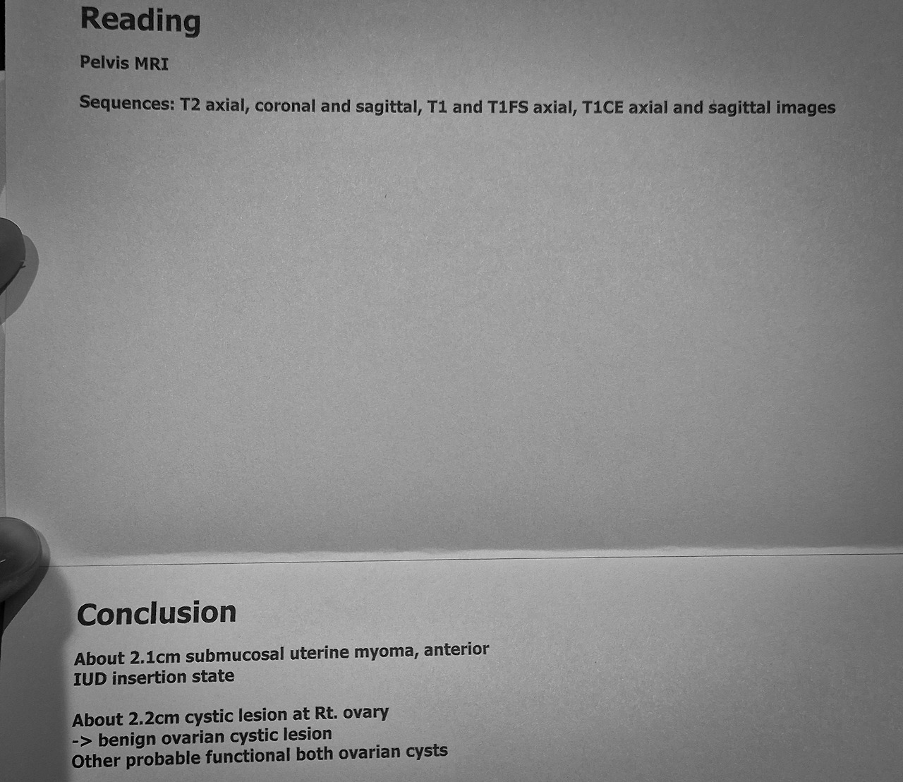 결국 D 병원에서 MRI를 찍었고 원장님의 진단은 역시 점막하근종, 완전한 제거를 위해 복강경이나 로봇수술을 권하셨다. 위치가 안 좋으므로 로봇으로 제거하고 꼼꼼하게 꿰매는 것을 추천하셔서 후기를 믿고 일단 수술 예약을 잡아버렸다.