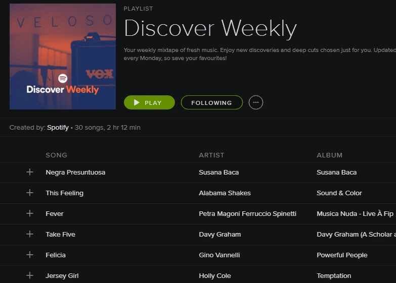 스포티파이가 2014년 머신 러닝을 이용해 음악을 분석하는 기술 기업인 Echo Nest를 인수해 내놓은 결과물이 바로 'Discover Weekly'이다. 매주 스포티파이의 8천만 이용자들은 30개의 추천 음악 리스트를 받는다.