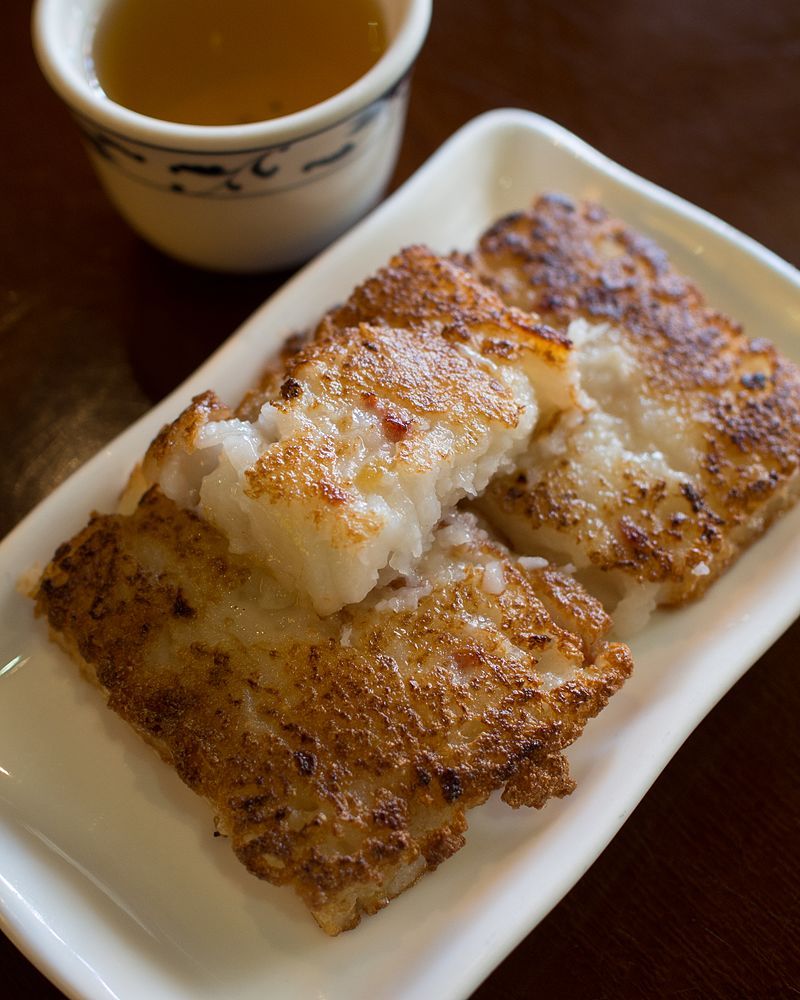 순 무 케이크에는 보통 말린 새우가 들어간다. 각종 재료를 넣고 스팀을 한 다음 냉각시킨 후, 중국 무와 쌀가루를 사용해 팬에 구워 낸다. 부드러운 무 맛과 짭짤한 양념이 꽤 조화롭다.