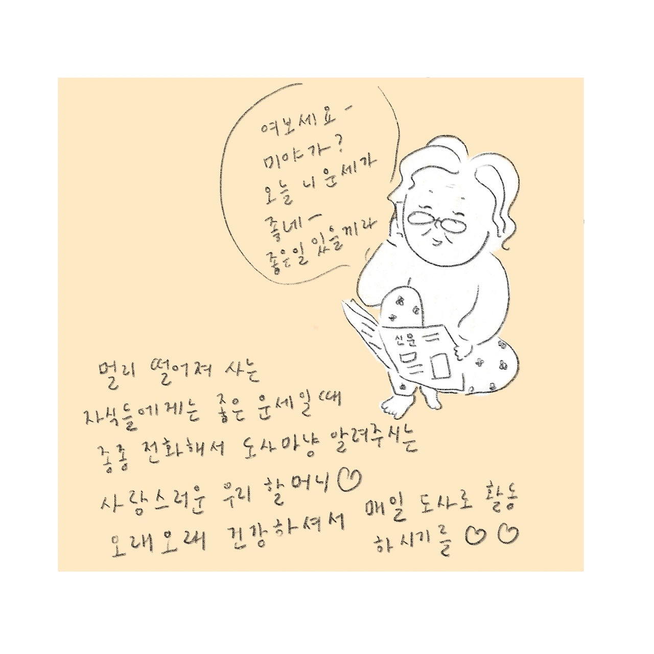 매일 운세가 적힌 쪽지를 받고 출근하시지만 귀찮은 내색 1도 없이 오히려 고마워하는 삼촌도 멋지고, 늘 순수한 소녀 같은 할머니도 참 좋다. 어떤 마음으로 매일 아침 또박또박 예쁜 글씨로 띠별 운세를 메모장에 옮겨 적으실지, 아마 엄마가 되지 않고서 나는 모르겠지!