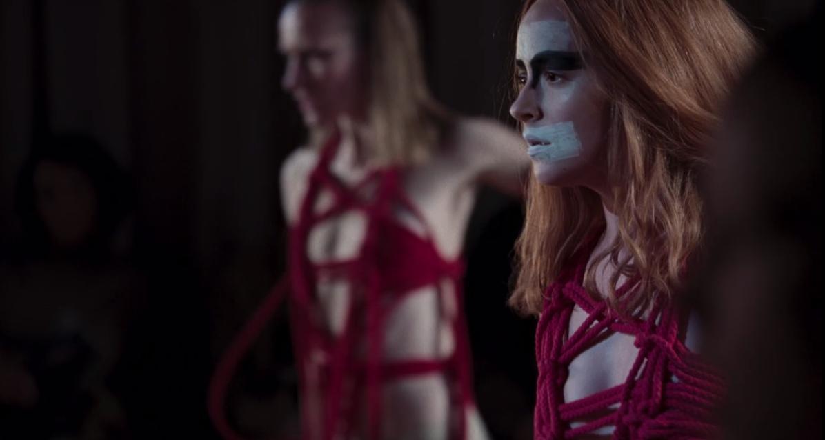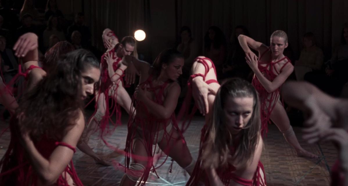 이는 영화 <서스페리아> 속에서 고스란히 찾아볼 수 있는데, 무용단의 공연 작품 ‘Volk’가 대표적이다. ‘Volk’는 독일어로 ‘민족, 국민’이라는 의미이며, 이는 전체주의, 민족주의를 내세운 히틀러의 사상과 상통된다. 작품의 안무는 신체의 직선을 활용하여 마치 나치식 경례를 연상케 하듯 매우 절도 있었는데, 관객 앞에서 공연을 하며 군무가 펼쳐지는 신(scene)에서는 그 에너지가 수배로 증폭되었다. 이 군무 장면에서 무용단의 몸에는 붉은 밧줄이 둘러져 있고, 작품의 중심인 수지의 얼굴엔 흰색과 검은색의 선이 그어져 있다. ‘흑, 백, 적’은 현재 독일 국기의 ‘흑, 적, 금’과 다른 독일 제국 시기의 국기 색상이며, 이 국기는 바이마르 공화국 당시 폐지되었다가 1935년 하켄크로이츠 이전까지 2년 간 나치 독일에서 사용되었다. 이러한 의상 자체의 색상만이 아니라, 전체적으로 색이 바랜 듯 음울한 배경색은 붉은색과의 대비로 무용단을 더욱 돋보이게 만들었다.