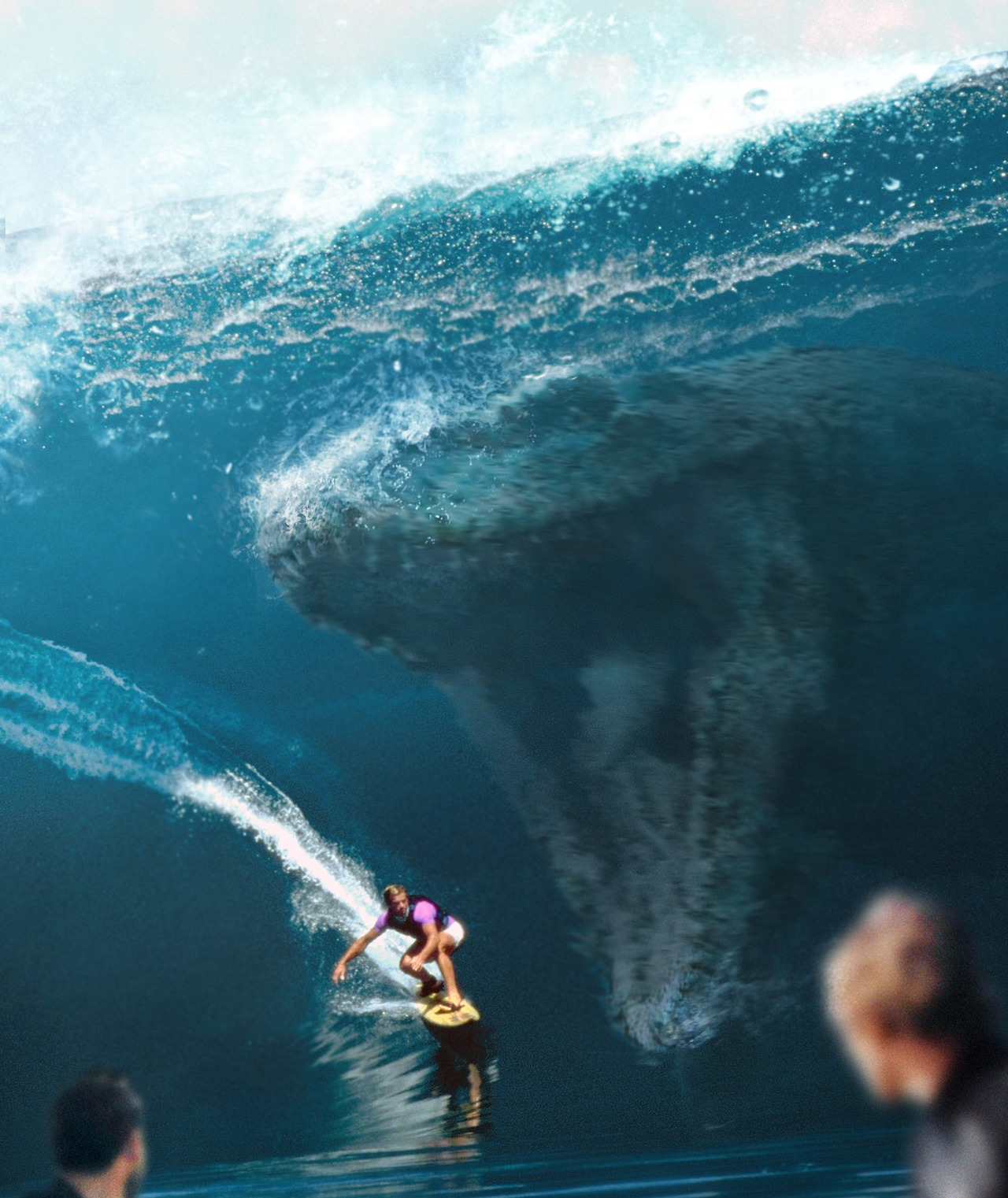 샌디에이고를 바라보는 티라노사우르스(좌), 서퍼를 습격하는 모사사우르스(우)