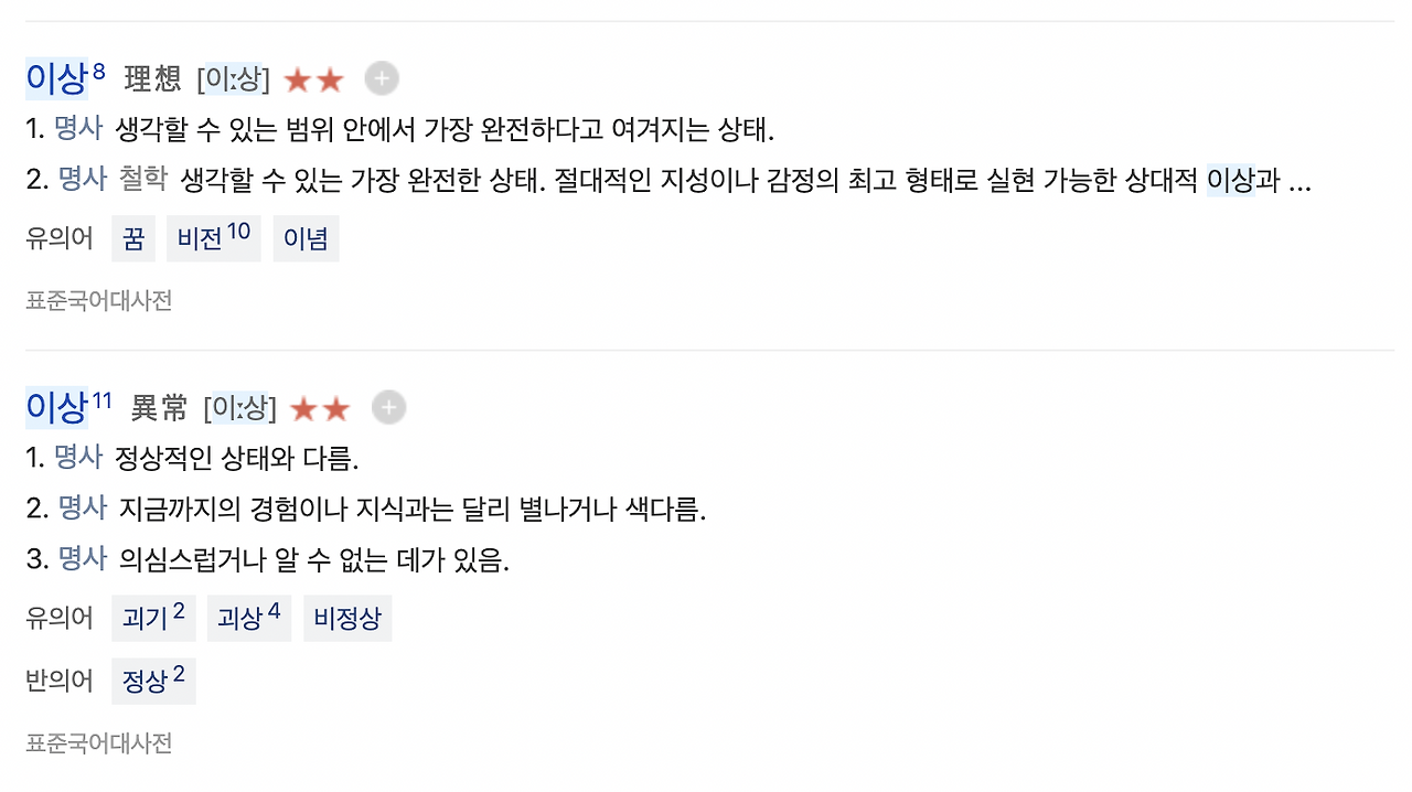 '이상'이라는 단어에는 서로 다른 뜻이 15개나 있더라.