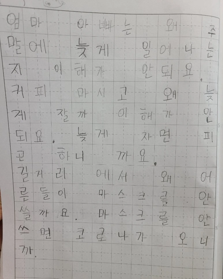 이제 좀 공부를 하라고 해야 하나 싶다가도 이렇게 엄마, 아빠를 유심히 관찰하여 글도 잘 쓰는데 뭐 어때 싶기도 하다.