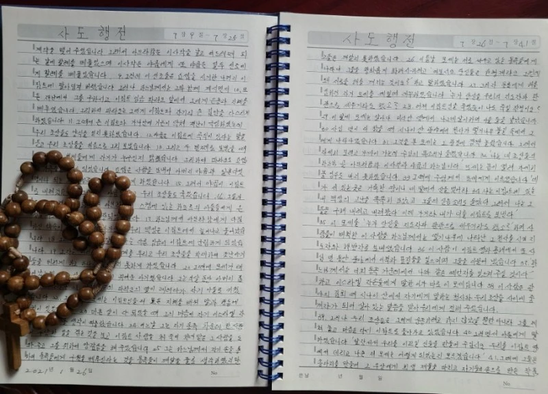 아빠가 하루에 있었던 일을 시간 순서대로 나열하면서 생각을 짧게 덧붙이는 일기를 썼다면 엄마는 책을 보고 베껴 쓰는 일을 했다. 책은 주로 성경책이었다. 가끔 나태주 시집도 필사했다. A4 크기 속지를 구멍에 맞게 고급스러운 붉은색 바인더에 끼우면 두께와 무게가 상당해졌다. 성경 필사 바인더가 책상 아래 발밑 공간을 한가득 채웠다. 내가 어릴 적, 네 식구 장판 위에서 둘러앉아 먹던 밥상이 엄마가 24시간 펼쳐놓는 책상이 되었다. 밥상 아니, 엄마의 책상은 크지 않아서 진한 남색 바탕에 금장 글씨가 박혀 있는 성경책과 쓰기 성경 스프링 노트, 그리고 펜으로 꽉 찬다. 그래서, 얼마 전엔 출판사에서 성경 필사를 위해 제작한 은총 성경 쓰기 잠언과 요한복음 편을 샀다. 홍보 문구에는 이렇게 쓰여 있었다. ‘시간과 장소에 구애받지 않는 필사’. 이렇게 간편하게 나온 것도 있냐며 엄마는 좋아했다. 엄마에게 필사는 투병 기간을 견디게 하는 힘, 아빠가 떠난 집에서 혼자라는 외로움을 잊게 하는 도구였다. 어쩌면 엄마 당신도 금방 떠날 수 있다는 두려움까지 안으며 스스로 토닥이는 시간과 힘을 얻었을지 모르겠다. 엄마의 필사는 신앙이자 취미였다.