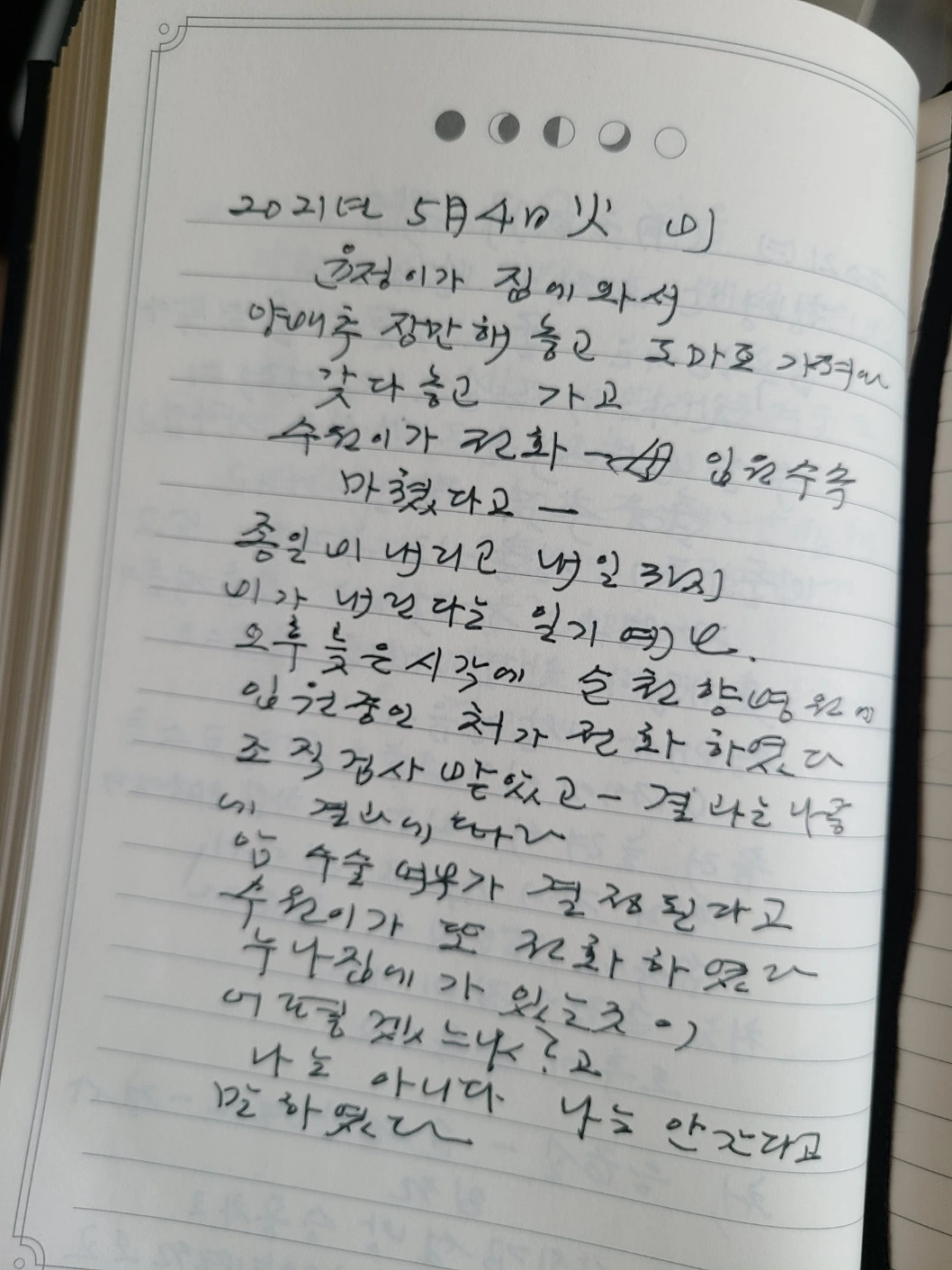 5월 5일, 아빠의 두 번째 기일이었다. 전국적으로 돌풍과 강우가 예상된다는 뉴스에 어린이날 광화문에서 탈 2층 서울시티버스 탑승권을 취소했다. 내심 다행이다 싶었다. 오전 아이들과 외출 후, 오후에 전 부치려면 시간이 빠듯했을 텐데. 더 놀고 싶어 하는 아이들을 재촉하여 들어오기 위한 잔소리 발사는 모두 내 몫. 어린이날까지 그러고 싶지는 않았다. 모든 법적 서류에 적혀있는 아빠의 사망일은 5월 7일. 하지만, 아빠의 일기장은 5월 4일에서 멈췄다. 아빠의 일기가 5월 4일에 멈췄다는 것은 5월 5일에 아빠가 우리가 사는 세상과 이별했다는 뜻이다. 해서, 아빠의 기일은 5월 5일이 되었다. 경찰은 절대 알 수 없는 아빠의 습관인 매일 일기장에 기록하기와 수첩에 메모하기. 김수환 추기경 선종한 2009년 2월 17일부터 노무현 대통령 서거일, 엔니오 모리코네의 사망 소식까지 기록되어 있는 아빠의 일기장엔 정작 당신이 떠난 날의 기록은 없다.