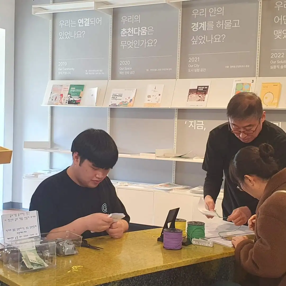 팝업스토어 방문객들이 현범님 소설 일부를 미니 책자로 가져갈 수 있도록 다듬어주는 현법님
