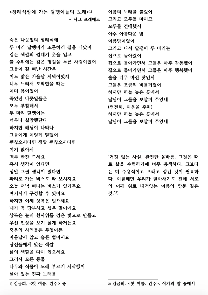 ‘거짓 없는 사실, 완전한 올바름, 그것은 때로 삶을 수렴하기에 너무 옹색하다. 그보다는 더 수용적이고 오래고 성긴 것이 필요하다. 이를테면 우리가 알아채기도 전에 서로의 어깨 위로 내려앉는 여름의 방문 같은 것.’