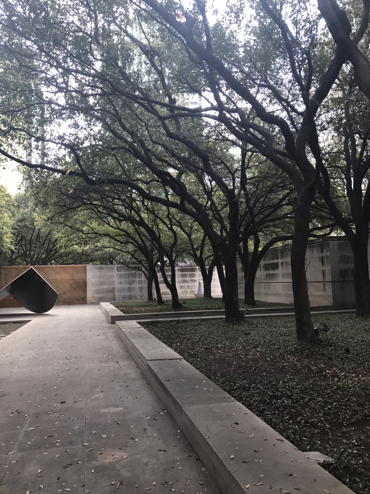 35번 고속도로가 도심 한가운데를 통과하노라면 아이엠 페이의 크리스털 결정을 닮은 빌딩이 정면에 나타나고, 그 옆에는 달라스 미술관이 자리 잡고 있다. 미술관 옆 크리스털 모양을 한 빌딩이다. 이 빌딩의 정식 이름은 fountain place라고 알려져 있다. 미술관은 옆집 크리스털 빌딩과는 대조적으로, 살짝 비탈진 길 위에 지어져 4층 건물임에도 불구하고 정면에선 보자면 나지막한 단층 건물로 보인다. 미술관 건물을 둘러싸고 긴 삼각형 모양을 한 가로수가 단아하게 심어져 있어 그 아래를 걸어보고 싶게 만드는 무척 정감 어린 길이다. 출입구는 정면과 후면 양쪽으로 나있는데 실내로 들어서면 복도는 약한 경사의 오르막을 오르고 오른쪽으로는 전시실 입구가 소리 소문 없이 나 있다. 복도를 따라 걷다가 자연스레 우회전을 하면 주제별 전시실이 펼쳐진다. 달라스 미술관이 무척 아름답다고 느끼는 이유는 미술관의 복도와 전시실을 따라 걷다 보면 어느 사이엔가 자연스럽게 마주하게 되는 실외 정원들 때문이다. 실내의 형광등 빛과 실외의 자연광을 일정 간격을 두고 즐길 수 있도록 설계되어 있어 자연 속에서 그림들과 예술작품들을 편안하게 즐기는 기분이 들곤한다.
