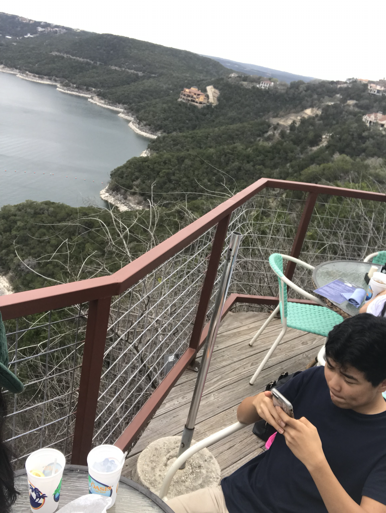 정오가 지나 레이스는 막을 내렸고, 레이스를 마친 아이는 상당히 고무된 기분으로 라고 비스타를 떠나기 싫어하는 눈치다. 주말 새벽 세시부터 일어나 경기를 펼친 아이를 격려하고자, 트래비스 호수를 한눈에 내려다볼 수 있는 오아시스라는 이름난 음식점으로 데리고 갔다. 도로의 양쪽으로 거대한 단층을 드러낸 암석 지대가 유려하게 솟아 있는, 그럼에도 불구하고 매우 단정한 도로를 지나고, 도로가 눈 앞에 직립해 있는듯한 급경사를 올라가기도 하면서 오아시스에 도착했다.