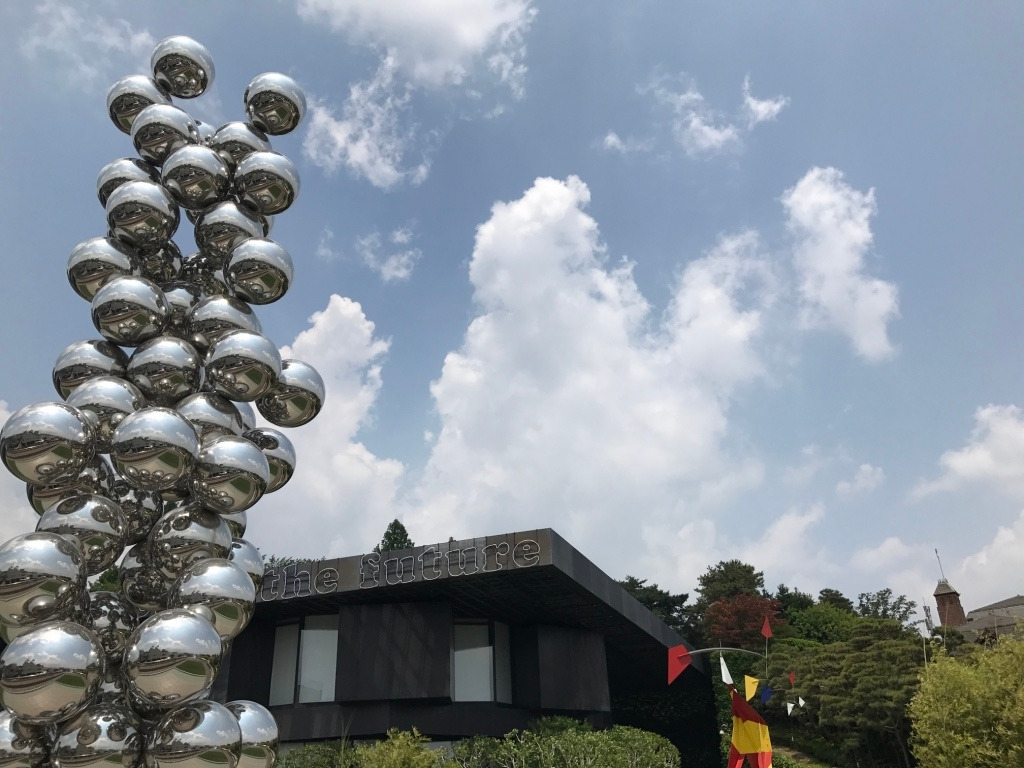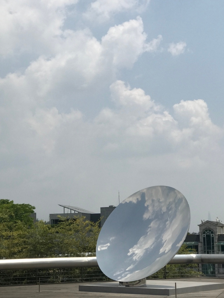 수직 기둥으로 쌓인 천 개의 눈을 가진 구슬 탑은 나를 비추고, 내가 속해 있는 환경을 비추고 있었지만 천 개의 구슬의 높이와 각도가 모두 달랐으므로 구슬에 반영된 나의 모습은 하나도 같은 것은 없었다. 수직으로 쌓아놓은 그 반짝이는 구슬 탑의 조형미도 아름다웠지만, 구슬에 반영된 나의 모습과 주변 환경의 변하는 모습을 한참이나 관찰하고 있어도 싫증 나지 않았다. 그 맞은편에 위치한 오목한 거울은 평면적이고 심플한 조형미를 발산하며 맑은 하늘 위를 바람처럼 떠가는 구름을 고스란히 담고 있었다.