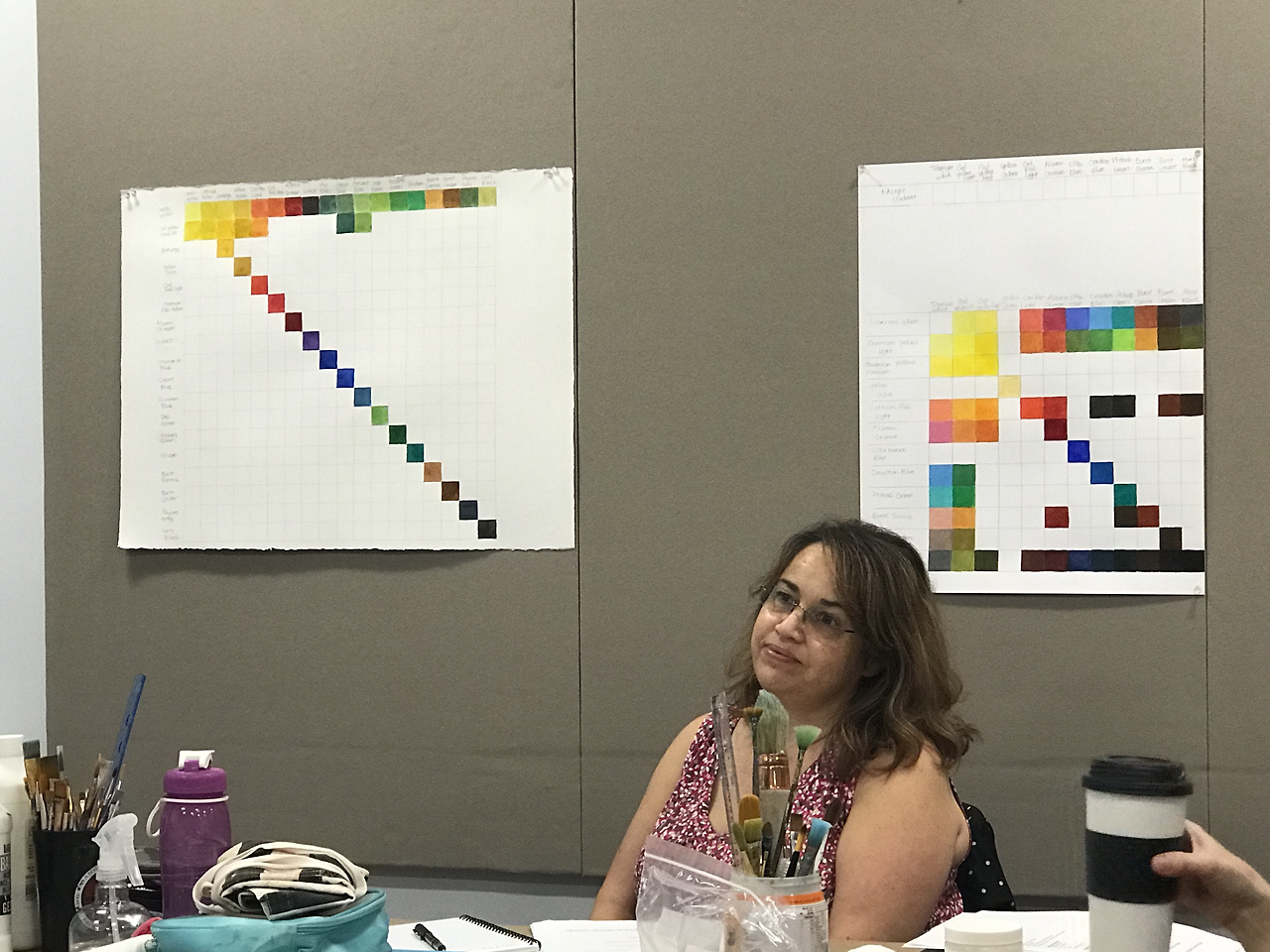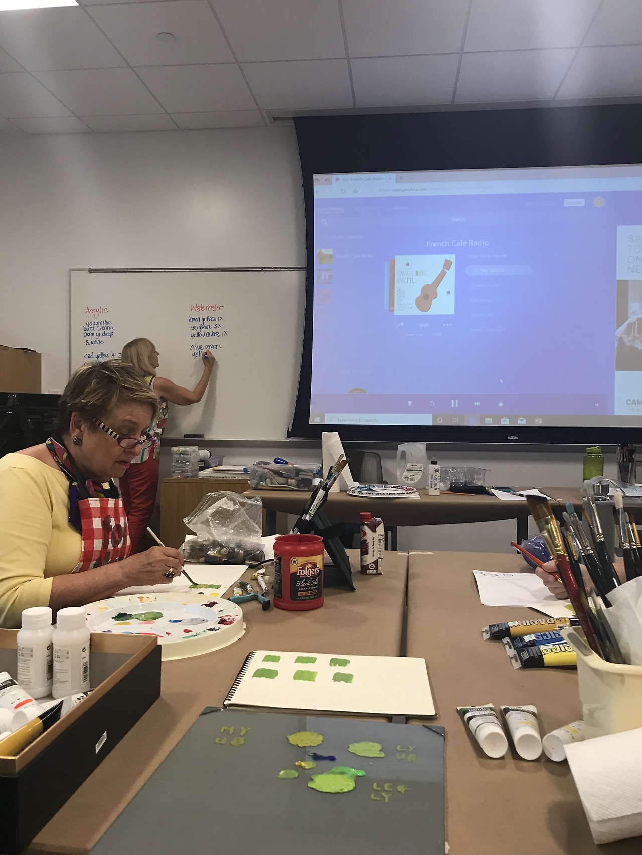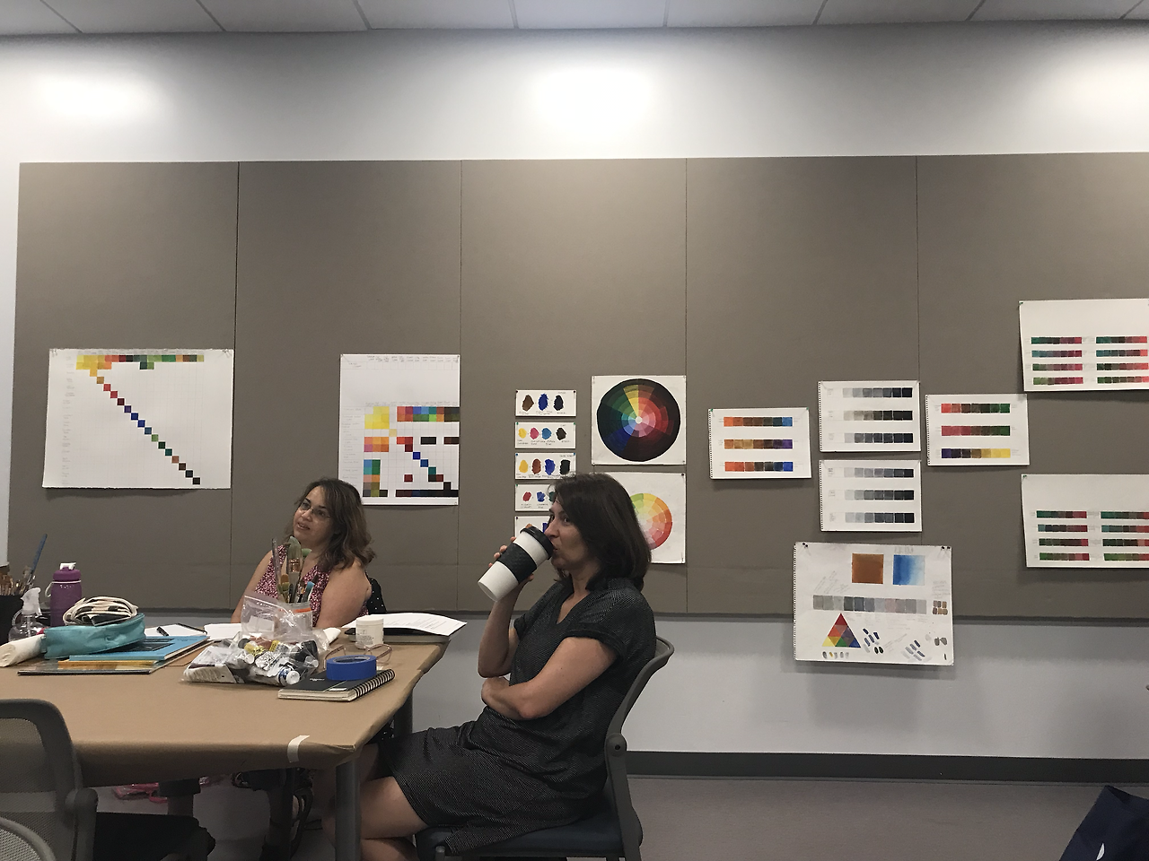 그러나 오늘 엘레강스한 엘런은 예술에 관한 정의를 내리고 빛과 색채에 관한 뉴턴과 괴테의 오래된 논쟁을 되짚으며 수업을 시작했다. 기억에 남는 한가지 정의는 누가한 말인지 모르겠지만 예술의 기능은 “혼란스러운 마음을 진정시키고, 고요한 (정상적인) 마음에는 동요를 불러 일으키는 것이라던 말 the function of art is calming disturbed mind and disturing normal mind. 그리고 예술가는 무엇을 하는가 라는 질문에 답은 keep calm and grow thick skin. 이라는 모토. 웃겼다. 수업 시작 전에 ice break. 편안한 예술 수업을 듣는 인원들은 대부분 여유자적 일찍 은퇴한 사람들이거나, world energy corridor인 이곳으로 expat으로 오게된 남편을 따라 온 젊은 부인들. 오스트레일리아 사람이 세명이 있었는데, 멜버른 출신이 두명 시드니 출신이 한명이 있다. 전형적인 슬라브 미인인 아나스타샤는 러시아의 바이얼리니스트인데 자신이 나온 예술대학을 자랑스럽게 소개했다. 그녀는 휴스턴 온지 몇년 되었는데, 자신은 온몸으로 휴스토니안이라고 외치고 싶다는 애향심을 자랑했다. 화려하고 부풀린 연극무대 의상같은 옷을 입고 머리에 거대한 초록색 리본을 묶고 나타난 젊은 여성은 흥미로왔고, 요주의 관찰인물이다. 35년간 나사에서 엔지니어로 일한 남편의 출장을 따라다니며 여행하는 것이 인생의 낙이라던 여인은, 남편이 정년퇴직을 3년 앞두고 있는 것이 너무나 슬프다며 11월에 노르웨이로 한달간 여행을 떠날 계획임을 알렸다. 백조같은 인생들이다.