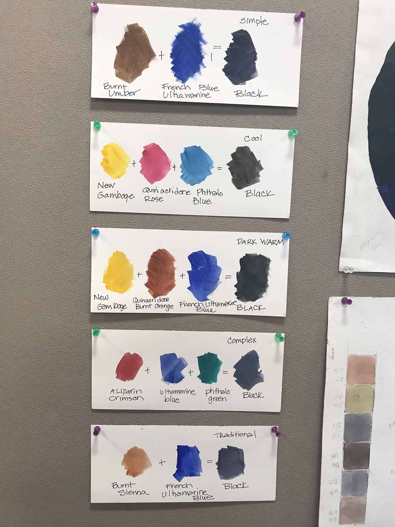 엘렌은 자신이 입고 있는 화려한 꽃무늬 블라우스에서 그린을 찾아서 색을 만들라고 했다. 밖에는 비가 내리고 있었고 앨렌은 까를라 부르니가 프랑스말로 부르는 노래를 배경음악으로 깔아주었다. 카를라 부르니의 허스키한 읊조림을 들으며 나는 고지식하게 cool blue와 light yellow 를 섞어 light olive green을 만들었다.엘렌이 가르쳐준 녹색을 만드는 다른 방법은 Light yellow 에 black을 병아리 눈물이나 고양이 눈물만큼 섞으면 다채로운 그린을 만들 수 있다는 것이었다. 노란색에 검은색을 아주 살짝 섞으면 그린이 나온다는 사실은 이미 경험해 보았던 것인데도 나는 그것을 색의 에러라고 - 노랑에 검은색을 섞으면 망함- 범주화 해두었지, 색다른 그린의 창조라고 생각하지 못하고 있었다. 이 방법은 소소하지만 굳은 생각의 틀을 깨는 방식이었고, 첫수업의 인상을 결정했다. 아울러 블랙을 만드는 다섯가지 레시피가 있음을 알려주기도 했다. 나는 여직 한 가지 밖에 몰랐다. 색채의 연금술은 언제나 경이롭다.