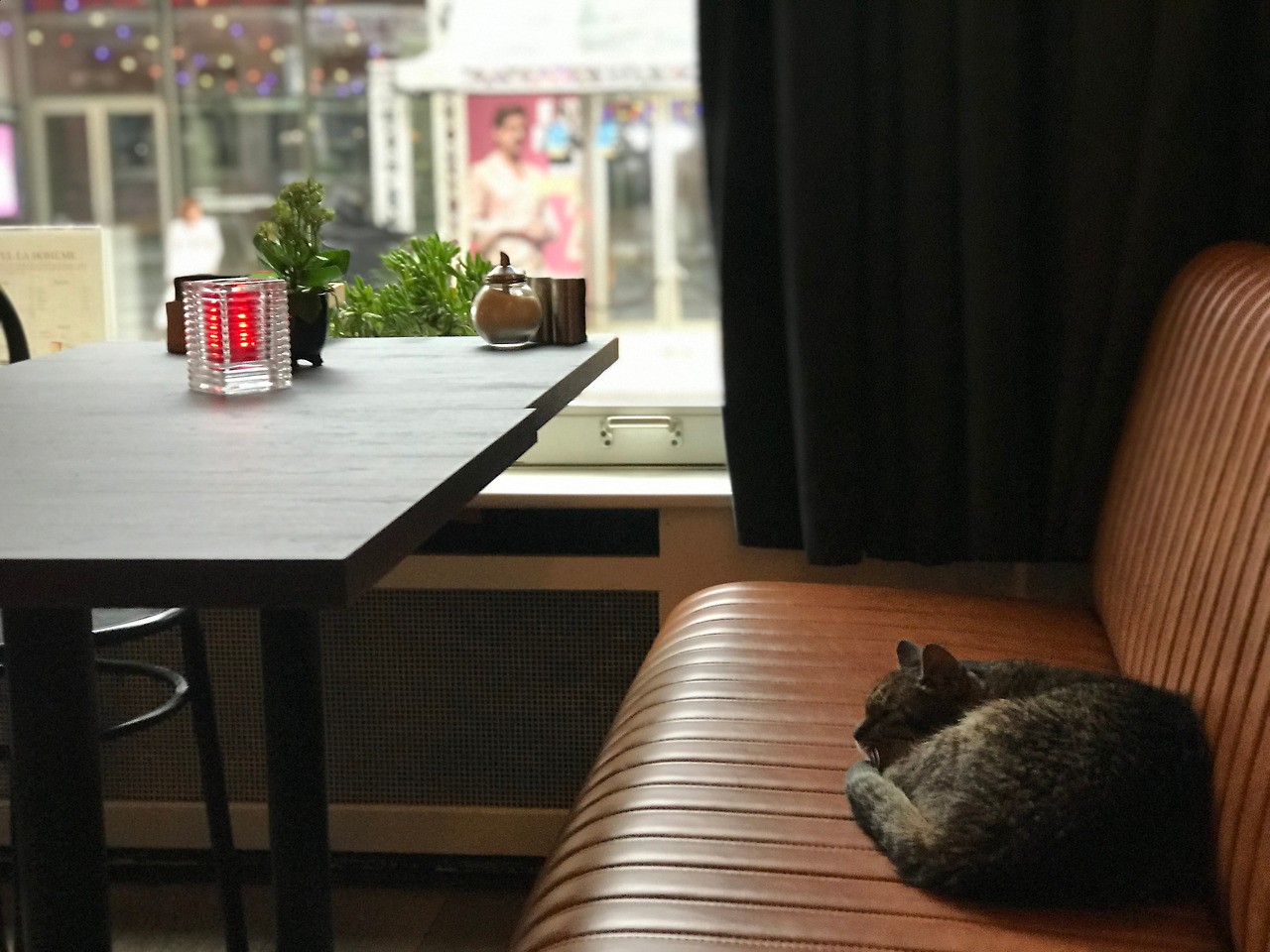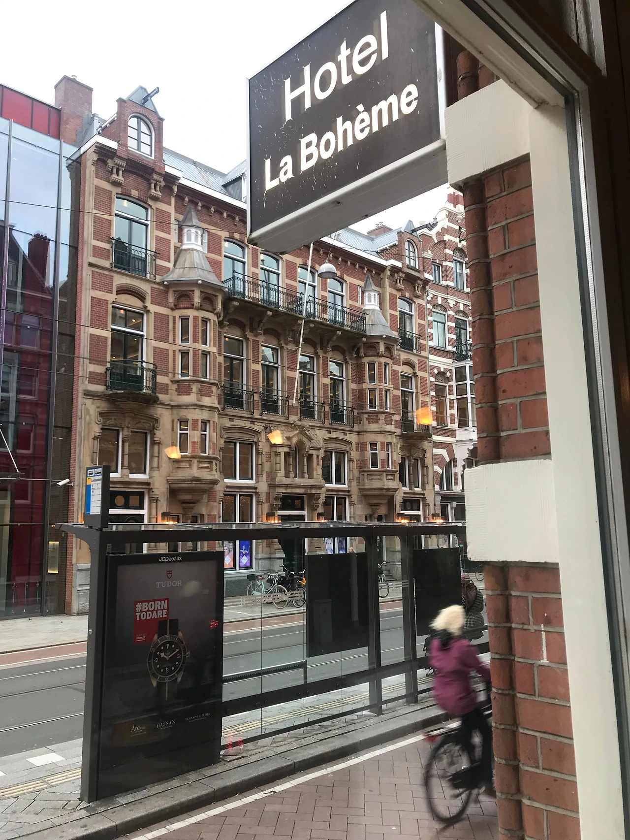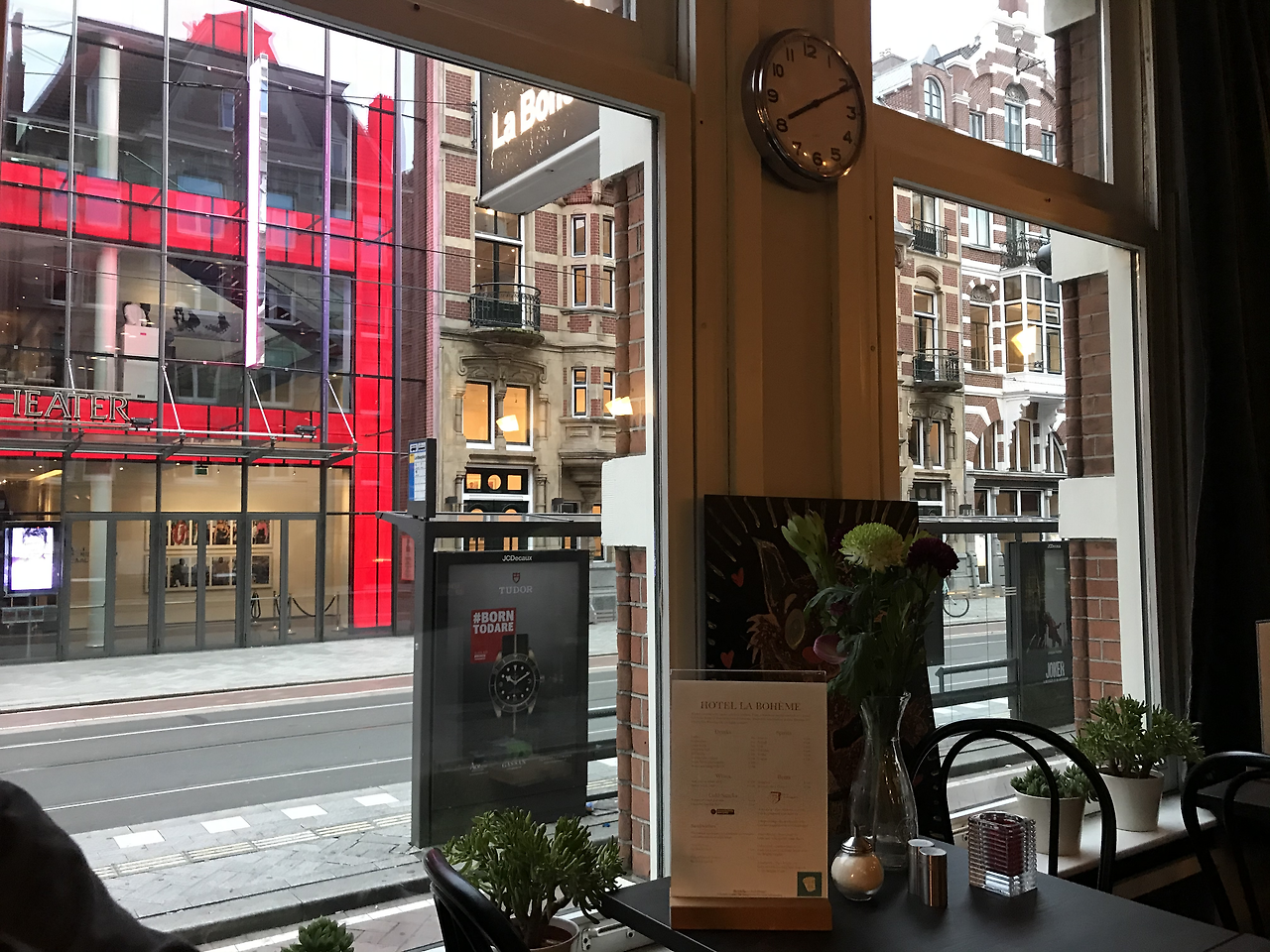 이튿날 아침 식사를 하러 내려가서 미미를 만날 수 있었는데, 그녀는 가장 넓은 부스를 차지하고 앉아 미동 않고 창 밖을 응시하고 있었다. 오페라 라보엠의 주인공이 미미이고, 호텔 라보엠의 주인공은 열아홉 살 난 고양이 Mimi다. 미미는 호텔의 마스코 트라기보단 안주인에 가까워 보였다. 실내 벽에 그림을 걸 수 있는 모든 공간에는 미미의 사진이 걸려있어, 열아홉 살 미미가 무지개다리를 건넌다면 이곳은 명실상부한 미미 박물관이 되는 것이다. 브랙퍼스트 공간에는 미미의 코, 미미의 수염, 미미의 오른쪽 눈을 글로즈 업 한 사진이 벽을 가득 채우고 있다. 미미는 좋겠네.... 이렇게 지극한 사랑을 받으니.. 우려반 기대 반이었지만 아침에 만난 주인장은 친절하고 서글서글했고, 올게닉으로만 준비한다고 하는 오이와 방울토마토는 힘찬 색이었고 싱싱했으며 네덜란드식 아침 식사는 간소했으나 만족스러웠다. 호텔의 정면에는 초현대식으로 단장한 붉은 조명과 유리벽의 극장이 위치하고, 창 아래로는 전철이 지나다녔다. 그리고 역시 그랬던 거다. 우리가 곧 미미 박물관이 될지도 모르는 퍼스트 클래스급 호텔방에서 웃다 지쳐 잠을 청하며 시간을 낭비하던 그 무렵, 차량 통행까지 제한된 호텔 뒤쪽의 거리에서는 온갖 극장 공연을 마치고 쏟아져 나온 사람들이 밤새 파티를 벌이며 토요일 밤의 불야성을 즐기고 있었던 것이었다. 토요일 밤은 비도 내리지 않았고, 기온도 너무 차갑지 않았다. 세계 각국의 사람들이 모여든 토요일 밤의 암스테르담의 브로드웨이는 얼마나 흥미진진했을까....,