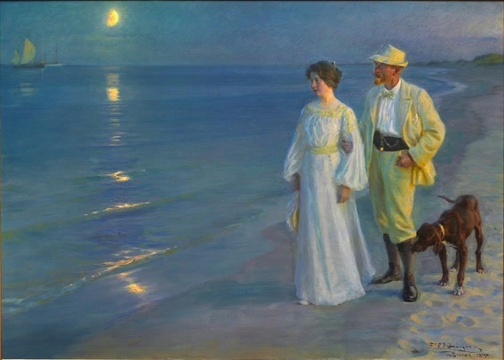 하늘에서 내려다보자면 덴마크의 유틀란트 반도는 어깨가 구부정하고 상투를 튼 거인을 닮았다. 그 거인의 상투 끝에서는 두 개의 바다가 만난다. 녹색의 북해와 푸른색의 발틱해가 서로를 향해 느리게 달려오지만 서로 다른 바다는 섞이지 못하고 염분의 농도차이는 선명한 색깔의 차이를 드러낸다. 땅이 끝나고 두 개의 바다가 만나는 곳이라니 상상해보지 못했던 낭만이 아닌가. 인적이 닿기 쉽지 않은 곳이겠지만 19세기 덴마크와 스웨덴, 노르웨이의 화가들은 바닷길을 건너와 이 마을에서 시간을 함께 보내곤 했다. 물에 씻은 듯 투명한 달빛은 스카겐의 밤바다에 보석처럼 흩뿌려졌고, 화가의 섬세한 시선은 캔버스로 보석을 받았다. 스카겐의 낭만적인 서정을 세상에 보여 준 화가의 이름은 페터 세베린 크뢰이어였다. 화가의 눈에는 한여름 밤 스카겐의 연보랏빛 해변은 아름다운 아내 마리를 위해 준비된 무대였다. 마리를 위해 반짝이는 달빛과 대기는 몽환적인 아름다움을 담고 있다. 제임스 휘슬러가 안개 낀 런던의 아스라한 밤의 서정을 <녹턴> 시리즈로 보여주었다면, 크뢰이어가 거닐었던 스카겐의 푸른 밤엔 독일 작곡가 막스 리히터 (Max Richter)의 <푸른 노트북 The Blue Notebook>이나 <빛의 본질에 관하여 On the Nature of Daylight>가 흐르고 있을 것 같다. 19세기 말 스카겐의 푸른 시간에는 스칸디나비아 땅끝의 황홀한 고요가 스며있다.