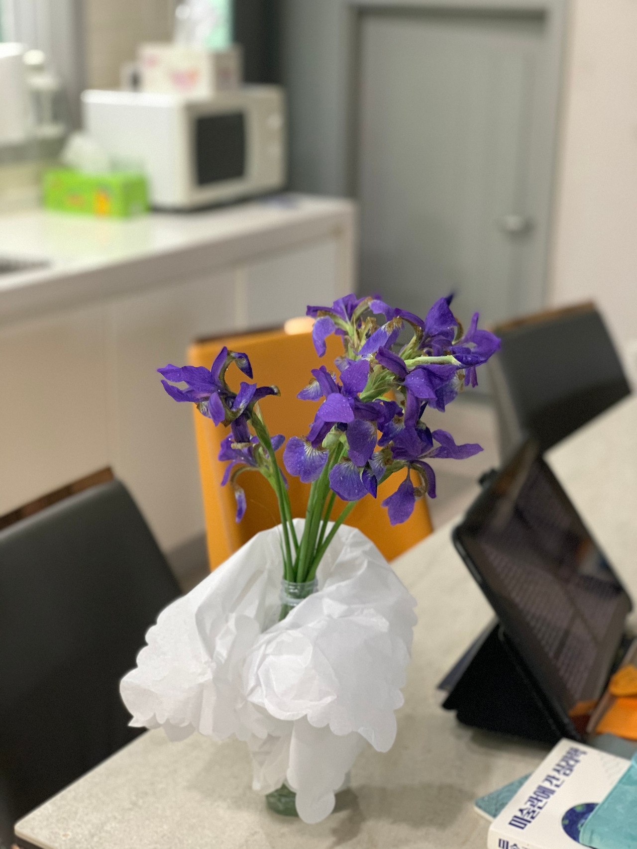 간밤에 비가 심하게 내린 다음 날 아침 정원에는 허리를 꺾고 바닥에 누워있던 아이리스들이 아깝기 그지 없었다. 꽃송이를 데리고 들어와서 물병에 꽂아두었다. 물병에 종이 치마 들러 놓고 쇼팽 들으며 한껏 기분을 내곤 했다. 오월의 색채는 보랏빛 아이리스