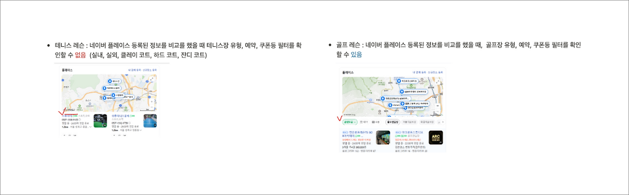 입증 4-2 : 테니스 레슨과 골프 레슨을 네이버에 검색했을 때, 골프레슨의 네이버 플레이스의 필터가 더 활성화되어있다. → 테니스레슨에 대한 데이터는 부족하다.