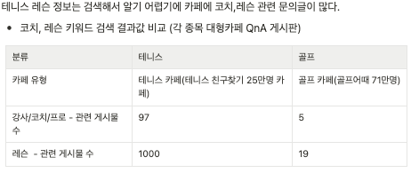 입증 4-1 : 테니스 레슨에 대한 정보는 유사한 종목인 골프레슨에 비해 온라인에 등록된 데이터가 부족하다.