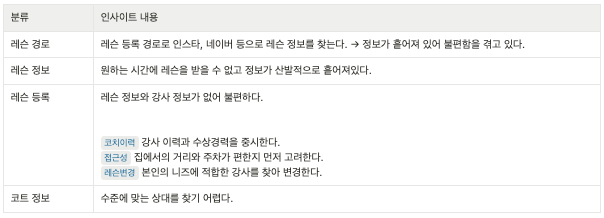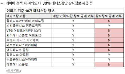 A. 위 문제에 대한 검증을 위해 데스크 리서치를 진행한 결과, 실제로 테니스 레슨 정보, 특히 '레슨 강사의 정보가 공개되어 있지 않아 문제'를 겪고 있었습니다.