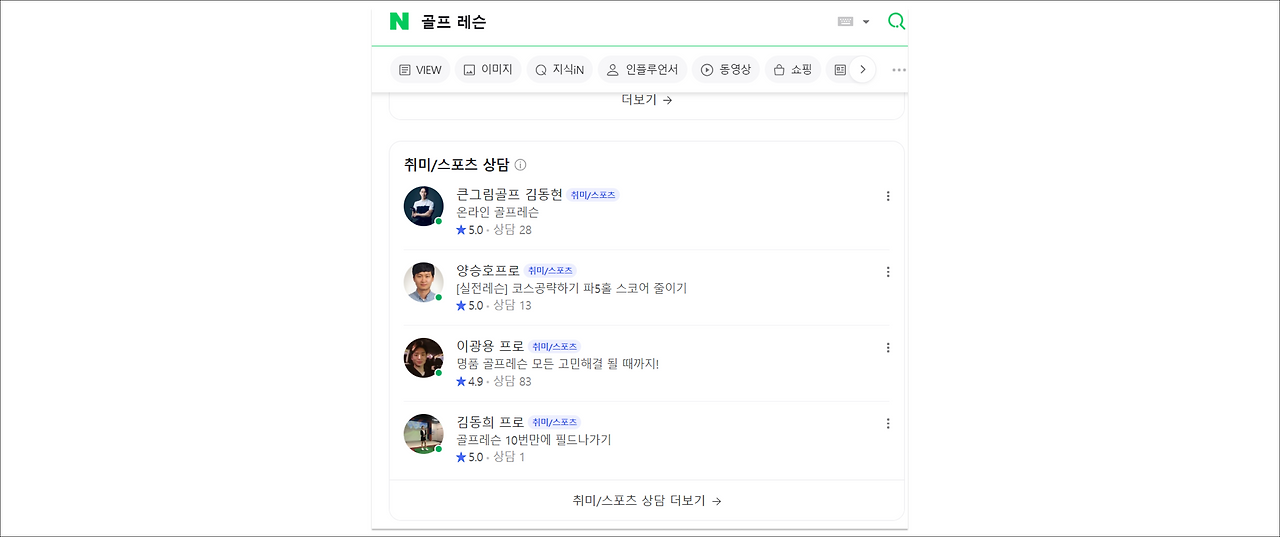 입증 4-3 : 테니스 레슨과 골프 레슨을 네이버에 검색했을 때 골프레슨만 취미/스포츠 상담이 가능한 프로(코치) 리스트업을 확인할 수 있다 → 테니스는 온라인에서 레슨에 대한 정보를 얻기 어렵다