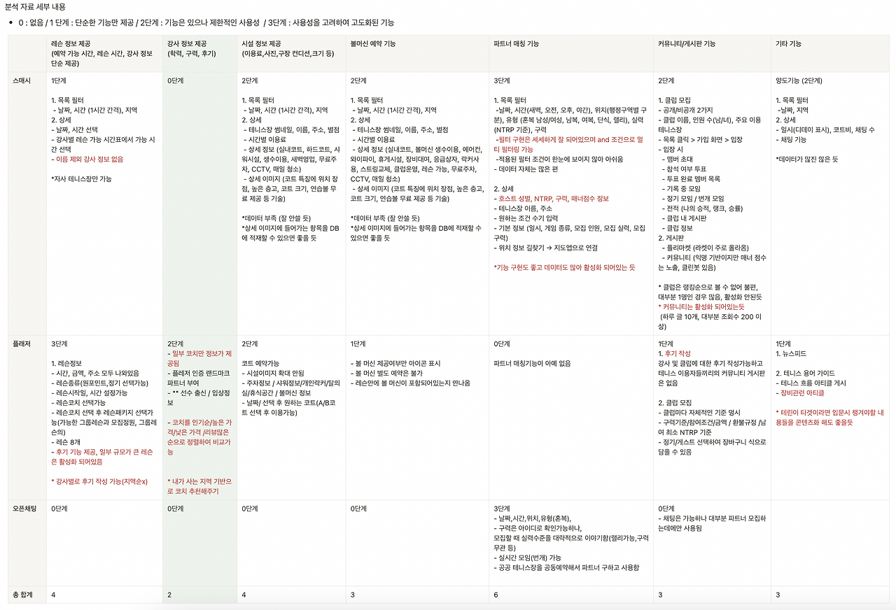 참고로, 가장 많은 답변이 나온 테니스장 예약의 어려움은 이미 서비스들이 존재하고 있었고(경쟁사 분석 참고), 테니스의 입문자에게 초점을 맞추어서 테니스의 시설이나 레슨 정보에 집중하고자 하였습니다.