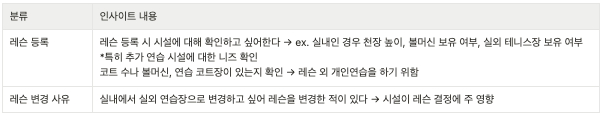 핵심 문제 : 테니스 입문 시 테니스 레슨에 대한 정보가 흩어져 있어 한눈에 정보를 구하기 힘들 것이다.