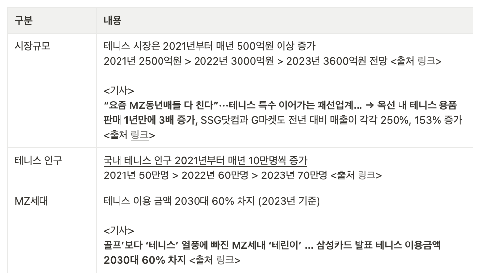 A. 보다 테니스 이용자와 시장규모가 급성장하고 있는 것으로 나타났는데, 급성장한 만큼 서비스가 부족할 것이라고 예상했습니다.