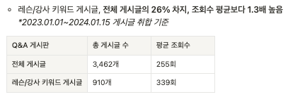 입증 3 : 테니스 대표 네이버 카페에 ‘레슨’, ‘강사’ 관련 게시물은 다른 게시물 대비 평균적으로 높은 조회수 기록하고 있다.
