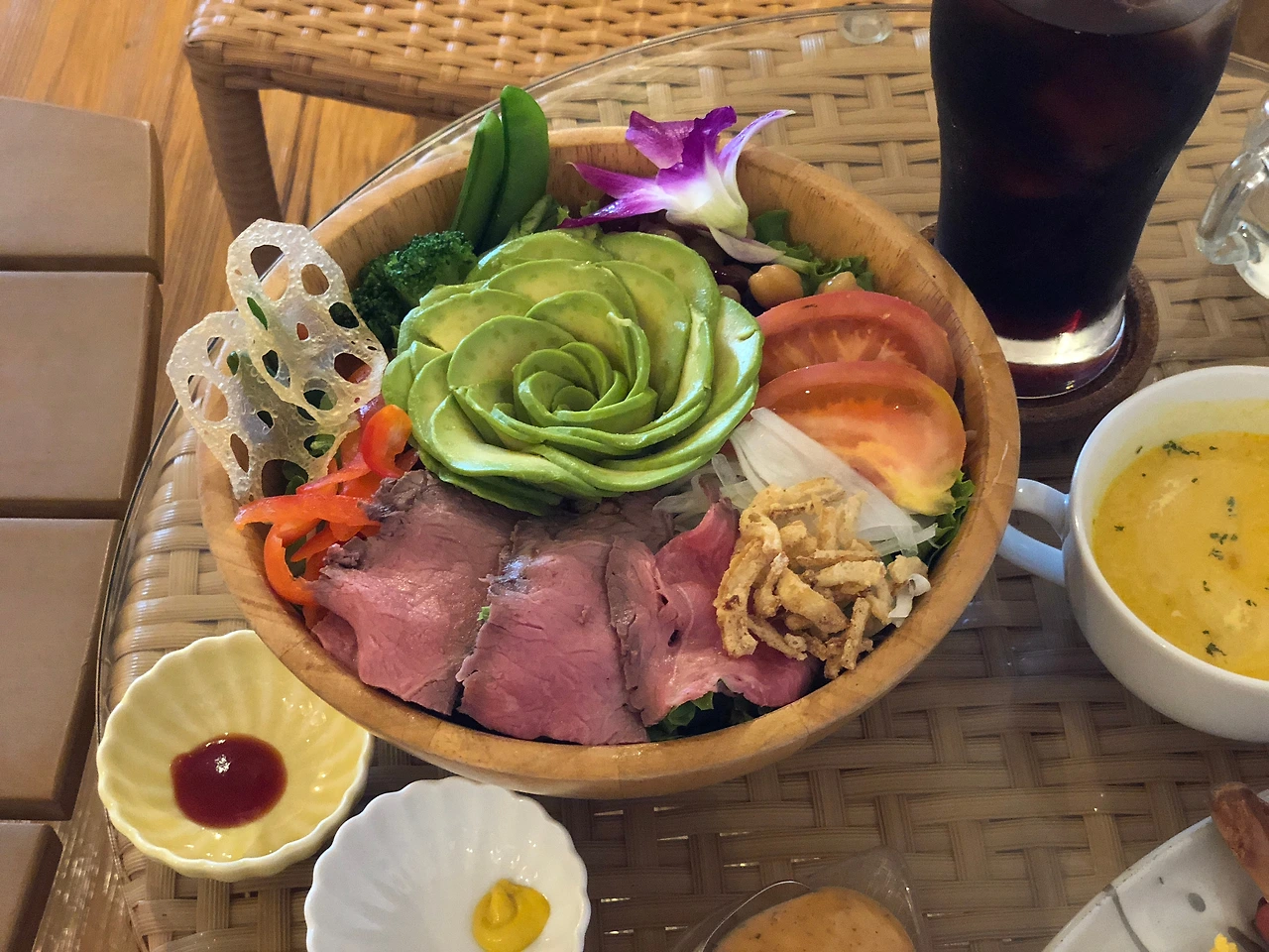 온도감과 더불어서 오키나와를 찾게하는 감각은 바로 '색감 폭행'을 당했던 기억이다. 도시 면면에 가득했던 채도의 더미와, 여기에 금상첨화 격이었던 <색깔 한 그릇> 가득 담긴 와규샐러드. 메마른 겨울의 창가에서 이 한 그릇이 문득 그리워졌다.