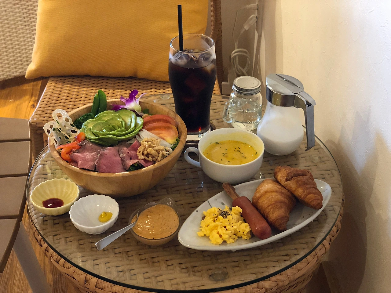 시그니처 메뉴를 주문하고, 얼마나 지났을까. 양 손에 샐러드 보울과 수프, 아이스커피를 든 종업원이 방끗하고 웃었다. 지금 생각해보면, 이것은 마치 '너는 곧 놀라게 될거야, 애송아'라는 눈짓이었던 걸까. 현실 음성으로 탄성이 터졌다. 와아- 색깔이 한 그릇이네.