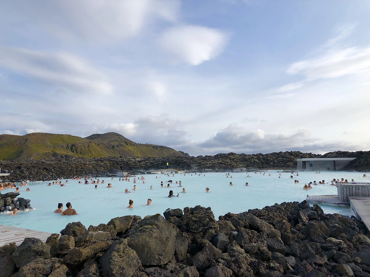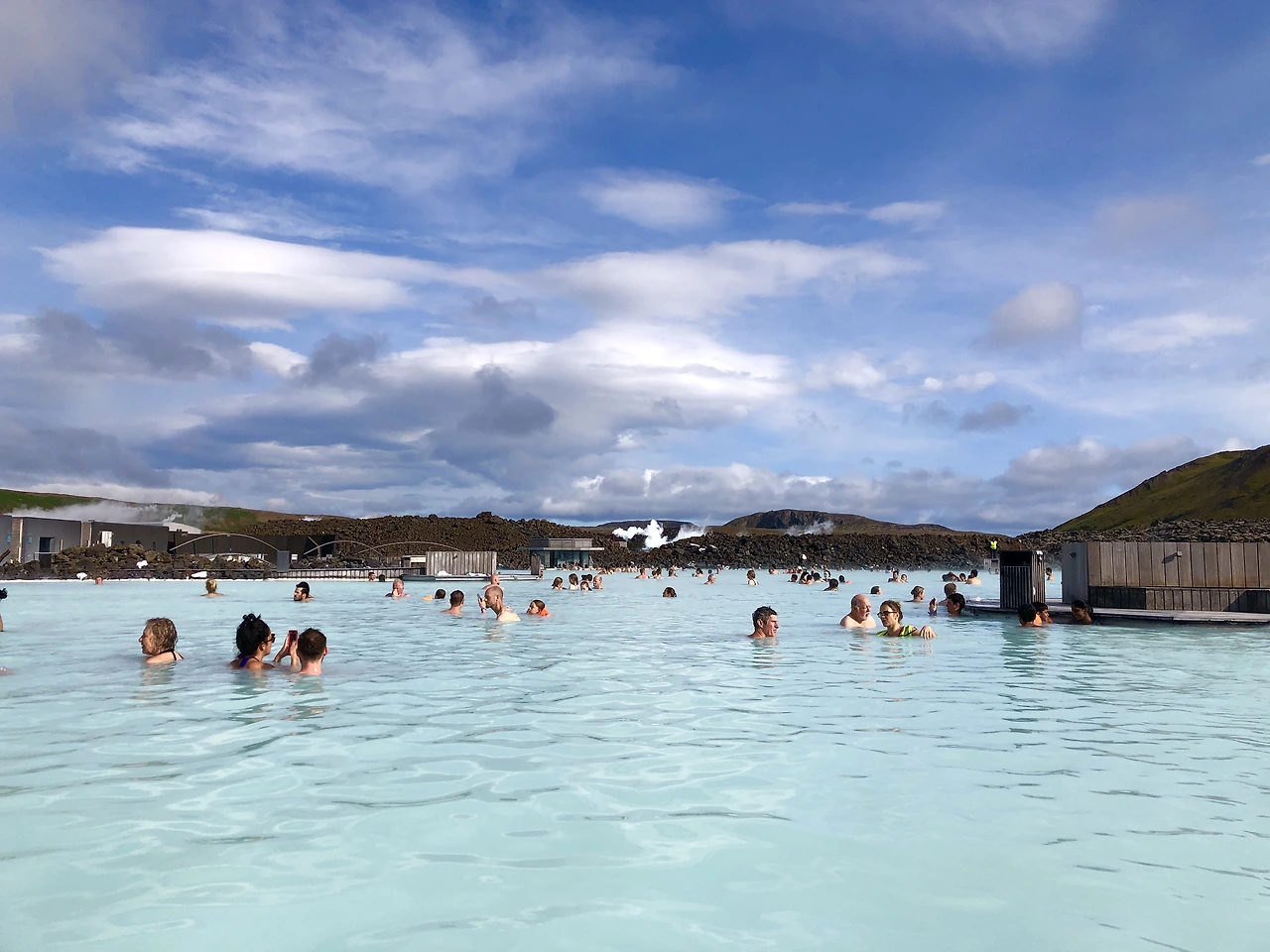 이끼로드를 쭉 통과하고 나니, 저 멀리서 연기가 피어오르는 장소가 보였다. 드디어 왔구나. 약간의 유황냄새가 느껴지고, 짙은 회색의 돌들이 쌓여서 지대를 만들었다. 단번에 인상을 압도하는 것은 그 사이에서 엿보이는 쨍한 하늘색의 물색이다. 놀랍게도 풀장의 인위적인 색이 아닌, 물이 자연스레 내뿜는 빛깔이라 대단히 이질적인 느낌이 든다. 하긴, 우리가 그리곤 하는 그림에서도 물은 항상 하늘색이 아니었던가. 블루라군을 찾는 이들이 가장 기대하는 색깔도 그림 속의 그 물이 형성하는 공간의 아우라다.