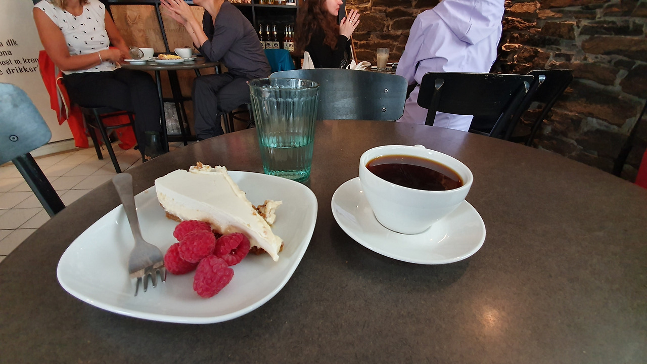Dagens kaffe(오늘의 커피)와 적적한 기분을 달랠 치즈케이크를 주문했다. 여담이지만, 북유럽에서 "Dagens~" 로 시작하는 메뉴는 "오늘의 메뉴"라는 의미를 가지므로 대개 이 메뉴들을 선택한다. 커피의 경우는 드립 커피를 의미한다손 쳐도, 음식점에서 "오늘의 메뉴"를 픽하면 항상 만족스러운 큐레이션을 받았던 기억이 난다. (여행자들을 위한 로컬 시그니처로 구성되기 때문인듯)