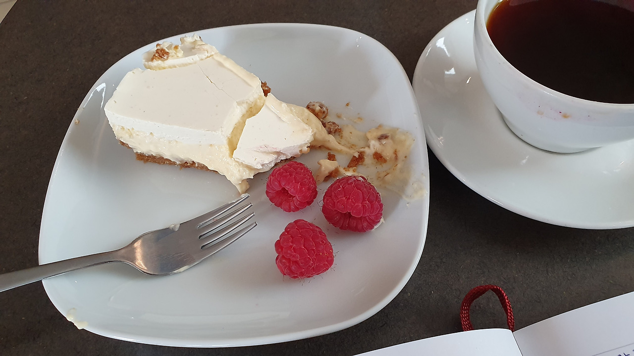 그도 그럴 것이 녹지 않는 바닐라 아이스크림의 맛이 났던 것. 그리고 그 위에 무심하게 끼얹어진 베리들은 냉동이 아닌 갓 손질된 말랑하고 톡 터지는 실온의(?) 베리였다. 포크로 케이크와 베리를 함께 맛보면, 마치 한 스쿱의 바닐라 아이스크림과 과육을 함께 먹는 느낌이 났다. 드물게도 '오늘의 커피'가 '오늘의 케이크'에게 완패해버렸다고 단언할 수 있다. 숙소에서 연락처를 나누었던 베르겐의 다른 여행자들에게 꼭 이 곳의 케이크를 맛보라고 알려주었다. 주인공은 너였어, 치즈케이크.