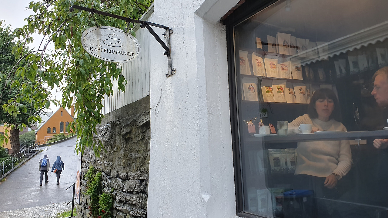 베르겐에서 예쁜 경치를 볼 수 있는 코스로 플뢰옌산을 타고 오르는 등산 열차가 있다. 직접 오르기에는 일정상의 제약이 있어 등산 열차 주변을 어슬렁거리던 차에 살짝 떠버린 시간. 이럴 땐 카페잉이 제격이지. 연중 300일 정도는 비가 온다는 베르겐의 촉촉한 골목길에서 Det lille Kaffekompaniet을 찾았다. 곧이곧대로 읽는 재미도 있는 이름은 "작은 커피 가게' 라는 의미를 가지고 있다.