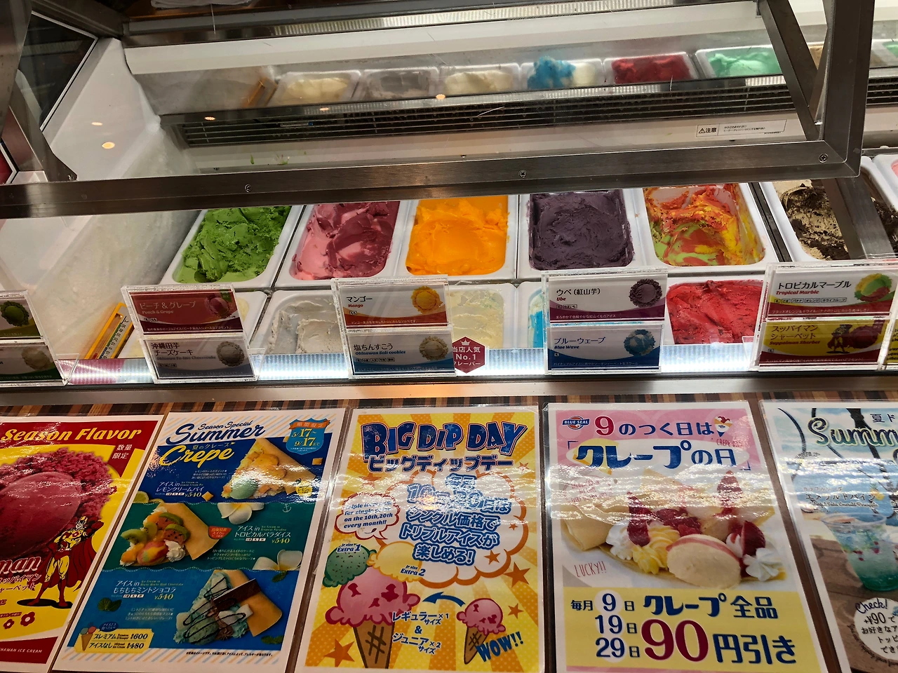 오키나와의 One & Only 로컬 아이스크림 브랜드. 1920-30년대 미국발 과장된 브랜드 디자인 톤앤매너를 갖춘 블루씰 아이스크림. 오키나와 곳곳에 포진하고 있어서 쉽게 즐길 수 있으나, 항상 사람들의 발길이 끊이지 않는 곳. 아이스크림 자체의 색깔도 알록달록 다양하여 베스*라빈*보다 먹는 재미가 충만하다. 단짠의 매력을 느낄 수 있는, 소금우유+자색고구마(오키나와산)를 베이스로 해서 먹는 기본 스프트콘이 가장 유명하다.