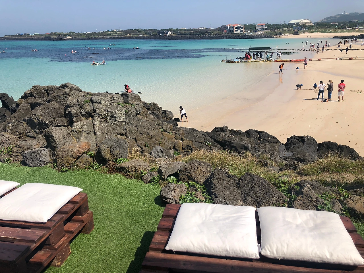 이튿날, 제주에서 한번 더 멀어질 길목을 찾다가 결정한 우도행. '땅콩의 섬'은 생각보다 대단히 아름답다고 연신 감탄사를 뱉으며 파워 라이딩을 이어간다. 통통통 배를 타고 도착하자마자 전기 자전거를 풀 악셀로 밟고 나니 팔뚝은 어느새 빨갛게 익어버렸다. 슬슬 자극감이 느껴지는 팔을 부여잡고 휴식처를 모색한다.