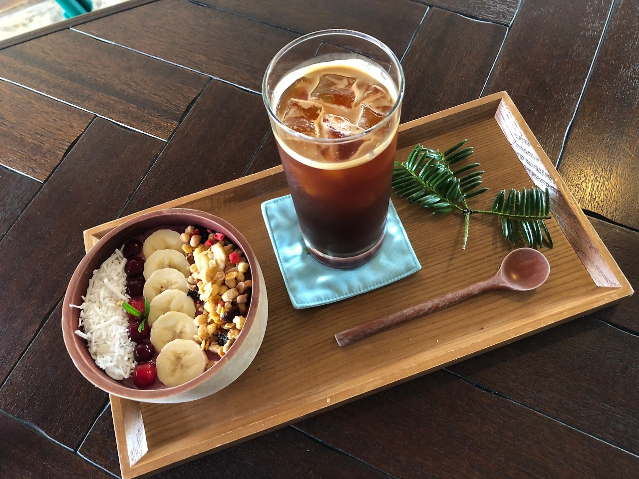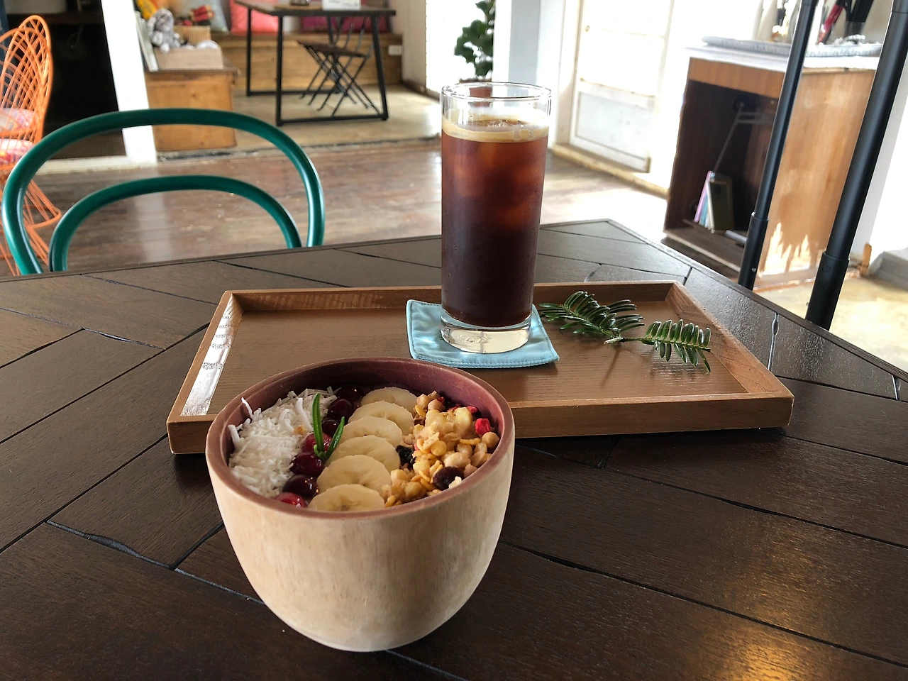 플레이팅의 시각적 재미뿐만 아니라, 알록달록 하기에 필연적으로 다채로운 재료의 식감에서도 아사이보울의 매력을 찾는 편이다. 가지런한 바나나 조각의 개수를 헤아리고, 크런치한 것들을 크렌베리와 같이 머금고, 코코넛 슬라이스의 식감을 비슷한 식재료와 헷갈려하며 우물거린다. 얼음이 가득 든 아메리카노 글라스를 스푼으로 통통 두드리고, 괜시리 찰랑거리며 기분을 내기 시작한다. 나의 휴가가 시작되었다는 전환감에 신나고, 부지런한 더듬이로 첫 식사를 이 곳에서 시작한 나를 칭찬해.