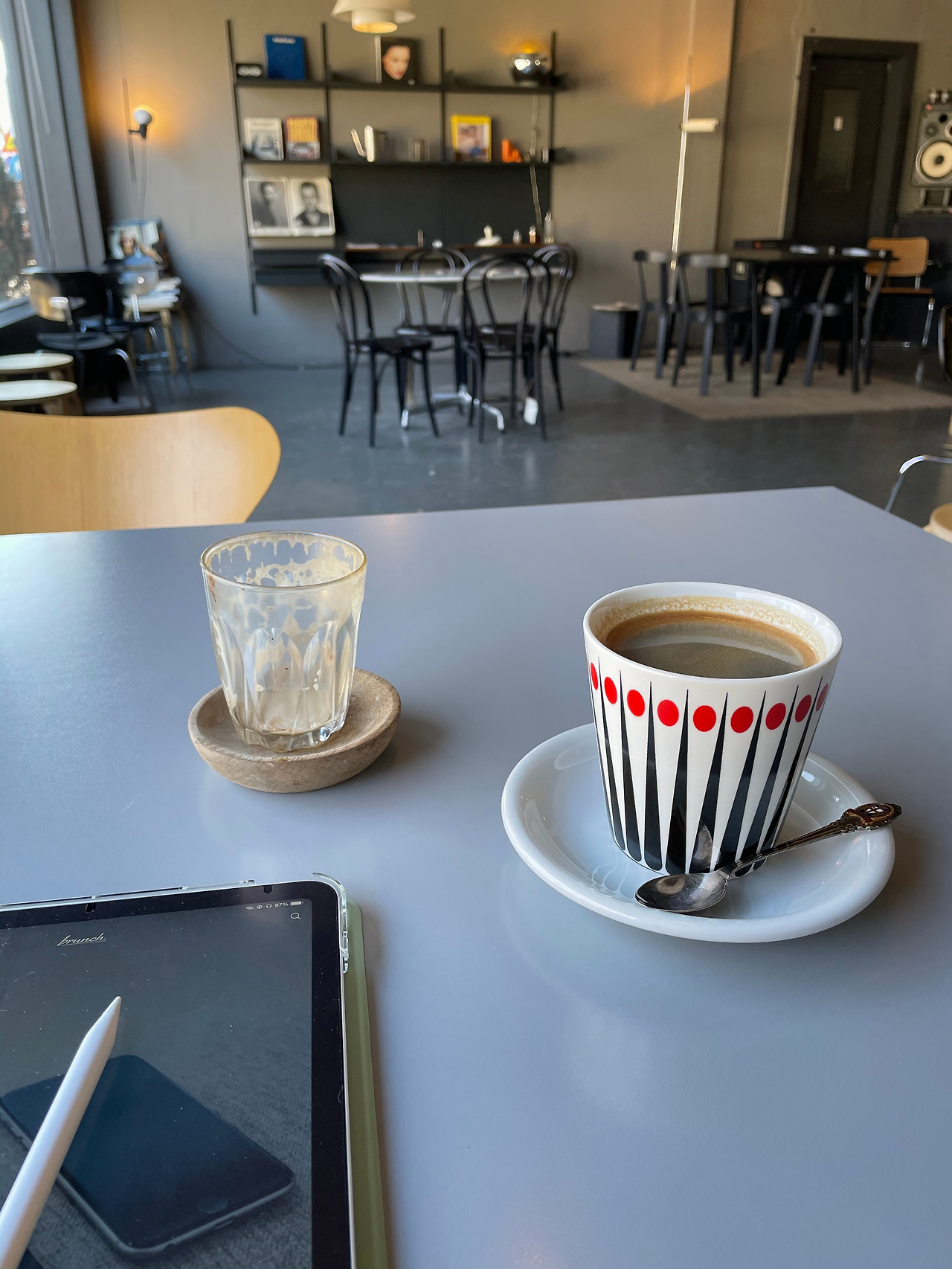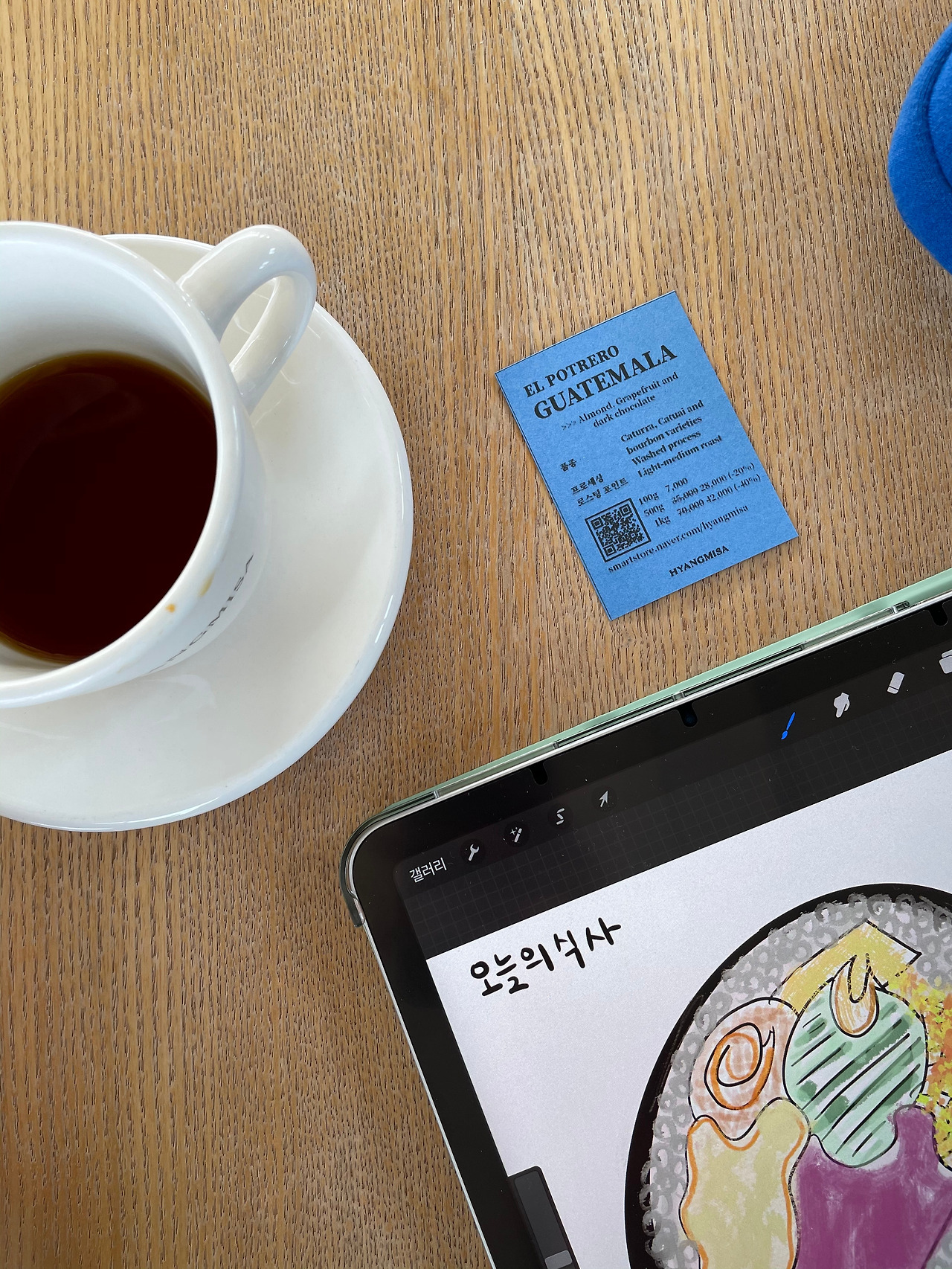 블랙이 압도하는 인테리어 속에 빼-꼼 고개를 들이민 재치있는 컬러 디테일이 재밌다. 꽉꽉 찬 따뜻한 공기에 음악이 흘러나오는 스피커의 진동이 느껴질 정도의 적막이 감사하다. 전세 낸 이 기분 너무 좋잖아. 흡사 개인 작업실에 있는 듯한 기분마저 든다. 커피잔을 내려놓고, 패드에 펜슬을 서걱이는 소리마저도 내 것이다. 오전에 준비한 읽을 거리와 드로잉 과제를 폈다.
