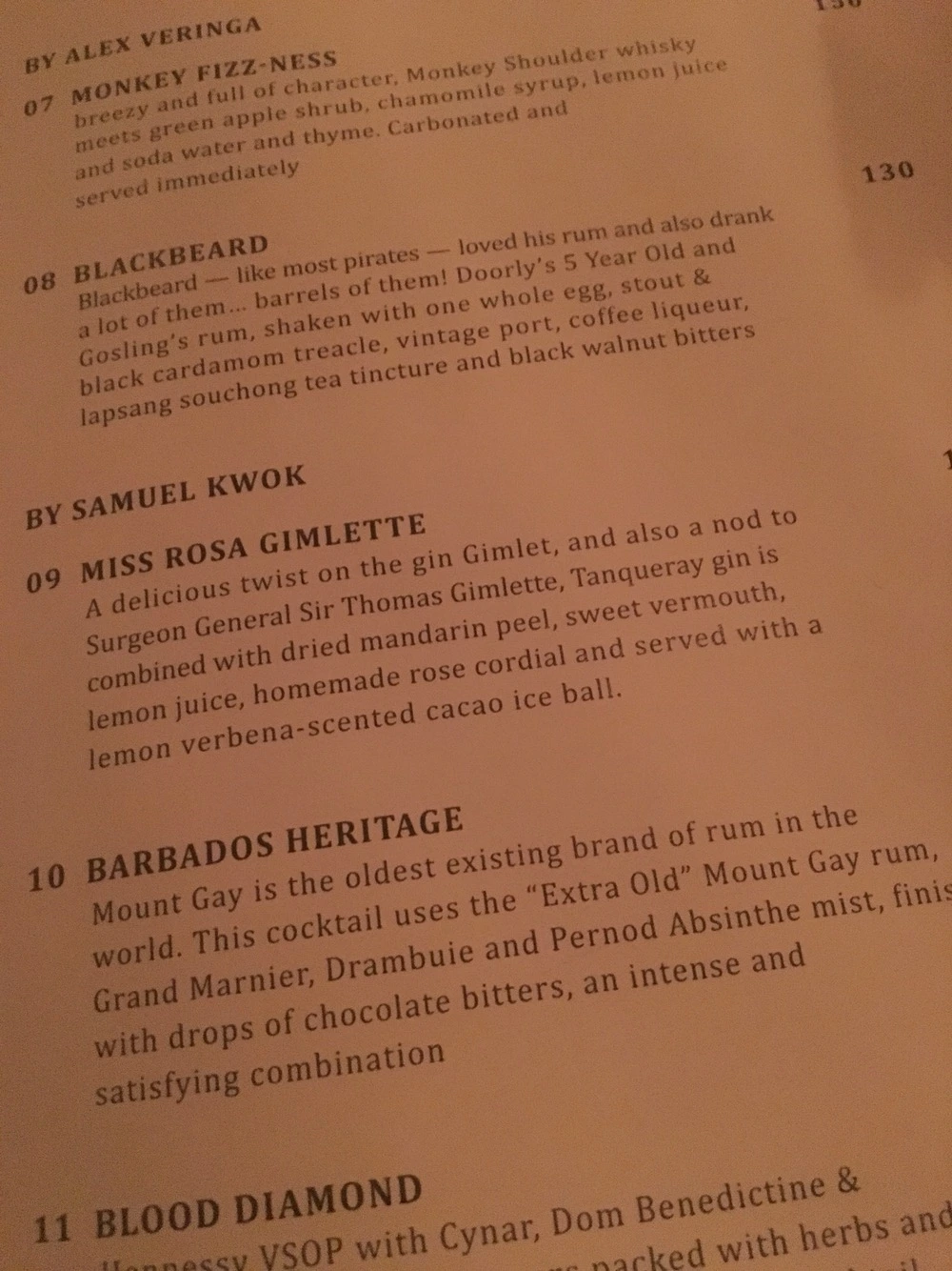 두번째로 선택한 칵테일은 미스 로사 김렛(Miss Rosa Gimlette). 옆 자리의 여자분이 먹는 모습이 귀여워서 즉흥적으로 선택하게 되었다. 칵테일이 묵직하게 풍덩 잠기는 카카오 아이스볼을 만드는 과정이 신기했다. 큰 아이스볼에 카카오 코팅을 즉석에서 입히고 예쁜 색깔의 롤리팝을 얹어서 제공한다. 술을 즐기지 않는 사람이 데이트에서 분위기 내고 싶을 때 시키는 메뉴같은 느낌이라, 내가 즐기는 류는 아니었다. 하지만, 칵테일은 본디 본위기로 마시는 술이 아니던가. 달콤하니 무알콜같은 슴슴함(?)에 홀짝이며 천천히 마셨다.
