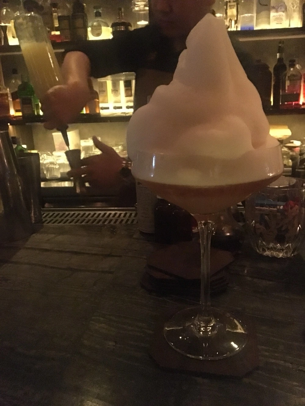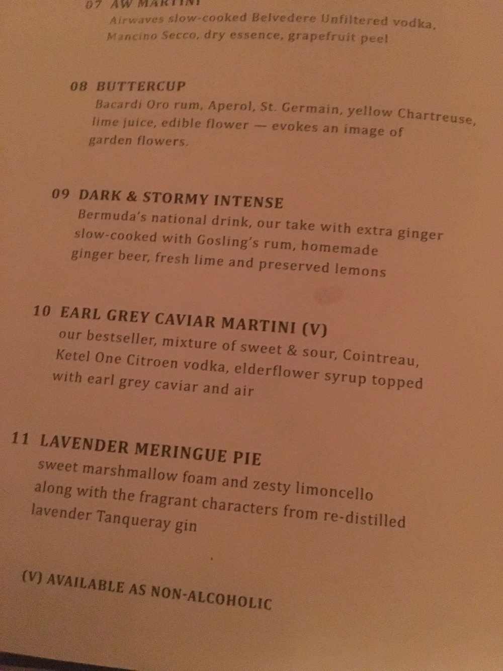 얼그레이 케비어 마티니(Earl Grey Caviar Martini) 는 보글보글한 거품에서 얼그레이향이 나고 아래에는 캐비어가 잠수되어 있는 마티니다. 바텐더가 장인의 손길로 쌓아 올린 거품탑을 용케 안 무너뜨리고 우아한 모습으로 클리어하며 뿌듯함을 챙긴다.