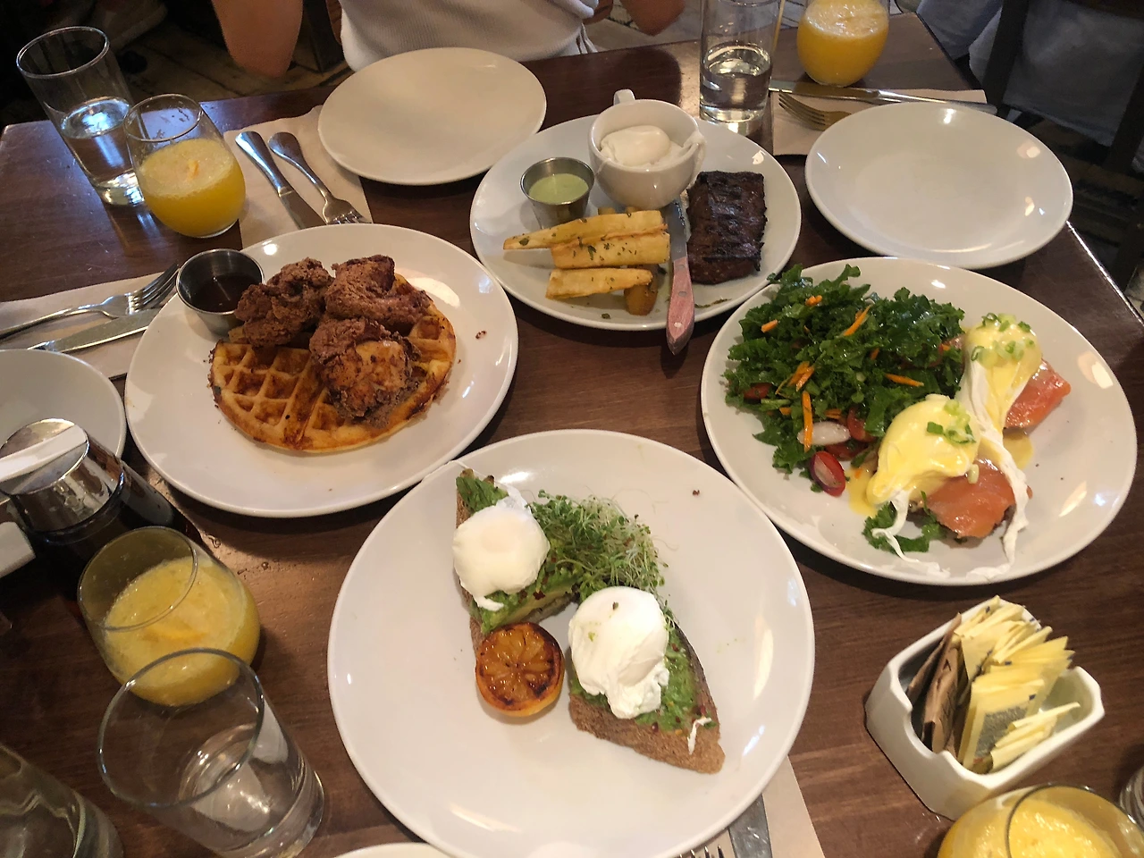 여행체력을 강인하게 길러온 경험치가 있기 때문에 모든 일정을 알찬 것들로 꽉 채울 궁리만을 했다. 이 곳에서만 할 수 있는 것, 평소에 할 수 없는 것은 뭘까?를 헤아리며 고민했다. 그렇기 때문에, 적절하게 운을 떼기에는 로컬식 브런치만한게 없다는 결론을 내린다. 태어나서 처음 보는 비주얼의 치킨 와플! 무려 와플에 치킨을 끼얹은 헤비함은 입맛을 돋우기에 충분했고, 스파클링 와인과 오렌지주스를 조합한 미모사 칵테일의 묘한 맛이 짜릿했다. 짠-하고 한번 더 웜업해주는 기분이랄까.