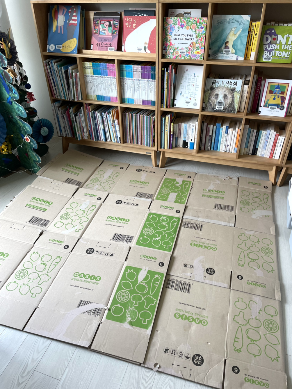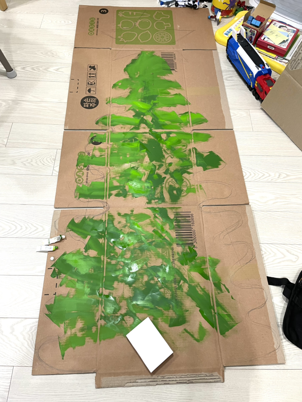 2년째 코로나와 대치 중이던 겨울 어느 날, 나는 택배 상자를 내다 버리지 않았다. 상자의 이음매를 뜯어서 거실 바닥에 기다랗게 툭 펼쳤다. 십 년 넘게 처박아 둔 붓을 집구석 어딘가에서 잡아 뺐다. 급한 데로 다 있다는 가게에 가서 물감을 여러 통 사 왔다. 크리스마스다! 올해엔 트리를 그려서 세워보자는 다짐으로 펼친 상자를 잡았다.