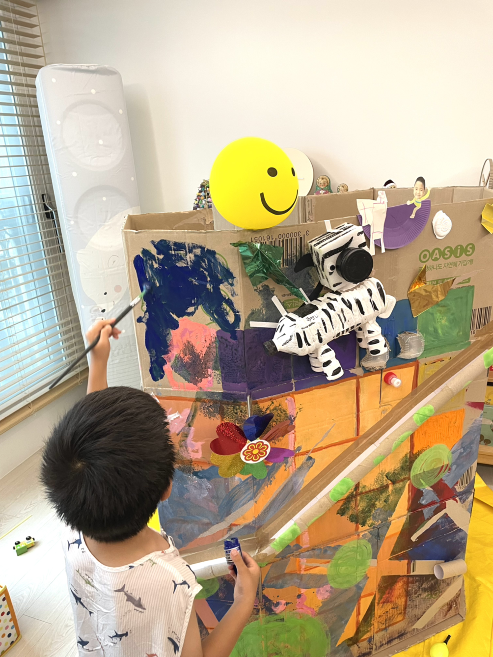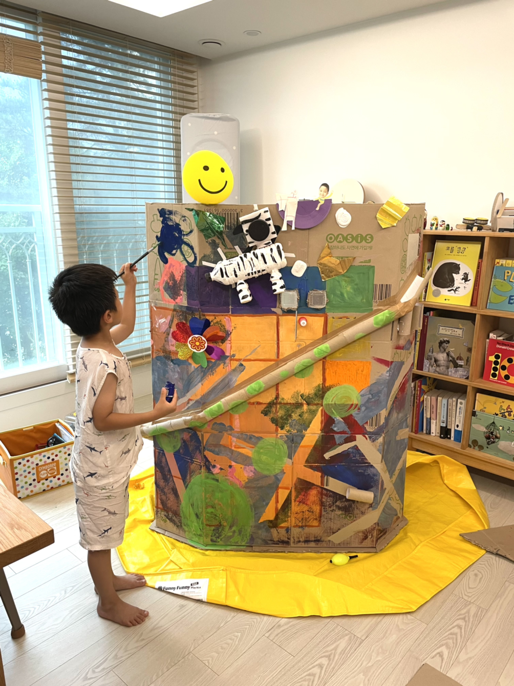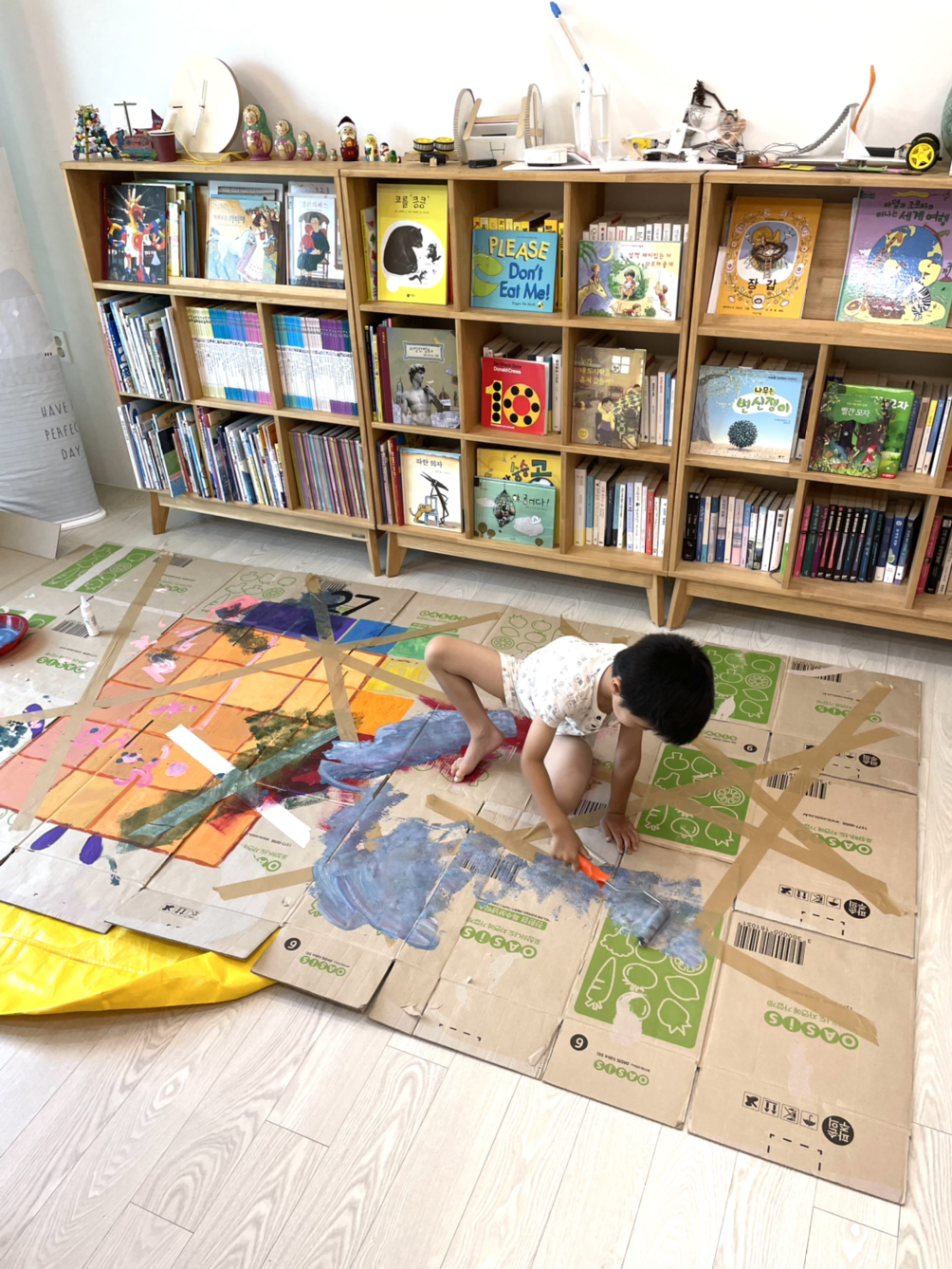 아이가 상자를 돗자리 삼아 앉아서 자기 주변만 이리저리 문질러 댔다. 본인이 칠하고 싶은 부분만 칠해버리고 딴청을 피우기도 했다. 아이 혼자 칠하기엔 너무 큰 스케일이긴 했다. 엄마의 거창한 계획은 현실 육아 앞에서 쭈글이가 되곤 했지만, 그래도 아이는 창작소 분위기가 좋았는지 만들기 하나가 끝나면 새로운 만들기 목록을 들이밀곤 했다.