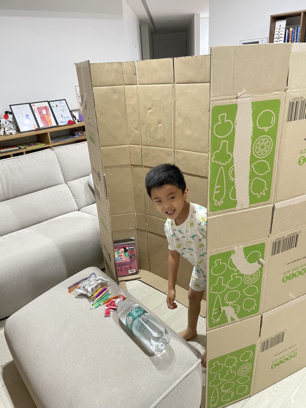 어린 시절을 돌아보면 지극히 개인적인 공간, 특히 다락방에 대한 로망이 컸다. 아이를 키워보니 대개가 품는 마음이란 걸 알았다. 자궁처럼 좁고 어둑하고 사적인 곳을 찾는 본능인가. 2층 침대도 어린아이의 또 다른 로망 리스트 중 하나일 거다. 아이가 유치원 절친 방에 놓인 2층 침대를 사진으로 봤다. 본인도 갖고 싶다는 말에 저건 2층 '침대'가 아니라 2층 '집'이라고 재빠르게 얼버무렸다. 마치 복층 구조의 집에 설치된 다락 침실인 것처럼 엄마 사람 특유의 처세술을 부렸다. 내 말을 그대로 믿는 아이의 모습이 귀여워 보이면서, 동시에 아이만의 공간을 만들어 보자는 새로운 상자 놀이 주제를 떠올렸다.